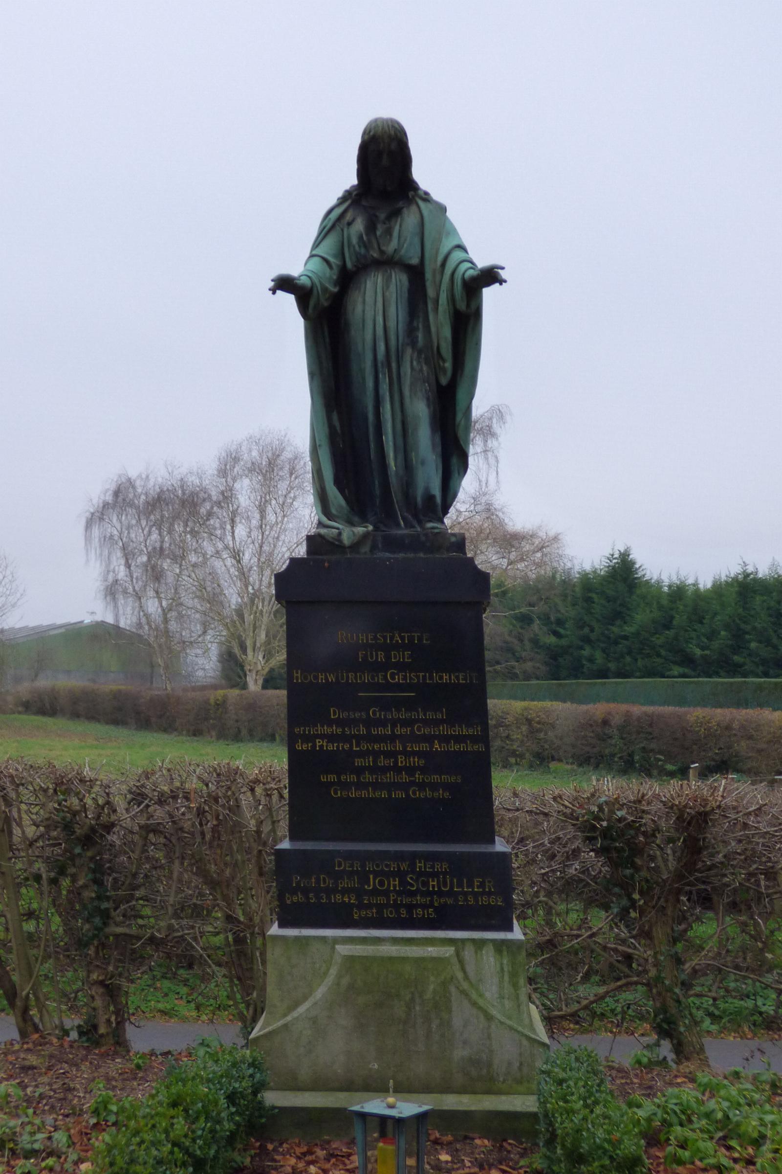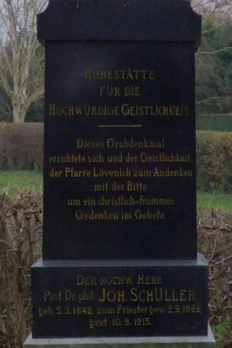 Standort: Die Priestergrabstätten befindet sich auf dem Friedhof Lövenich, in der Stadt Erkelenz. Sie sind Bestandteil der Friedhofanlage. Beschreibung: Auf den Priestergrabstätten sind die Priester und Geistlichen der Kirchengemeinde Lövenich beerdigt. Der Grabstein trägt folgende Inschrift. Ruhestätte für die Hochwürdige Geistlichkeit ------------------------ Dieses Grabdenkmal errichtete sich und der Geistlichkeit der Pfarre Lövenich zum Andenken mit der Bitte um ein christlich - frommes Gedenken im Gebet ----------------------- Der Hochw. Herr Prof. Dr. phil Joh. Schüller geb. 5.3.1842, zum Priester geweiht 2.9.1862, gest. 10.9.1915 Quellenhinweis: * Schriftenreihe des Heimatvereins der Erkelenzer Lande e.V. Nr. 17 Zeichen am Wege von Paul Blaesen