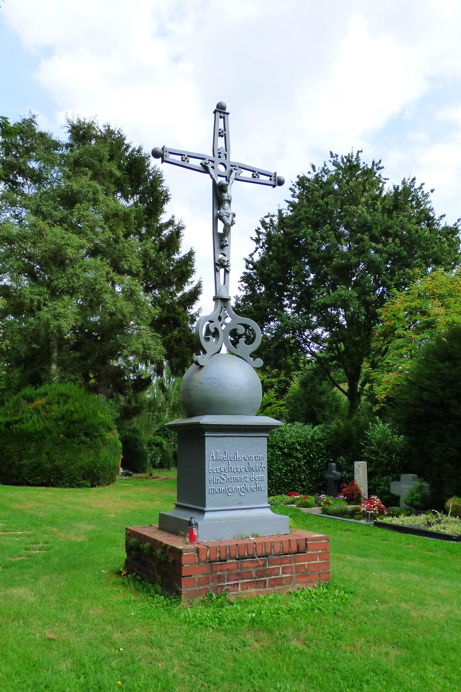 Standort: Das Friedhofskreuz befindet sich an zentraler Stelle des Friedhofs der Vogelstraße 13, in der Stadt Geilenkirchen. Beschreibung: Bei dem Friedhofskreuz handelt es sich um ein ca. 4,00 m hohes Metallkreuz mit einem Korpus. Das Kreuz steht auf einem gemauerten Ziegelsteinsockel. Das Kreuz ist Bestandteil der Friedhofanlage und trägt die Inschrift: Alle, die ihr vorueber gehet, sehet ob ein Schmerz dem meinigen gleicht. |