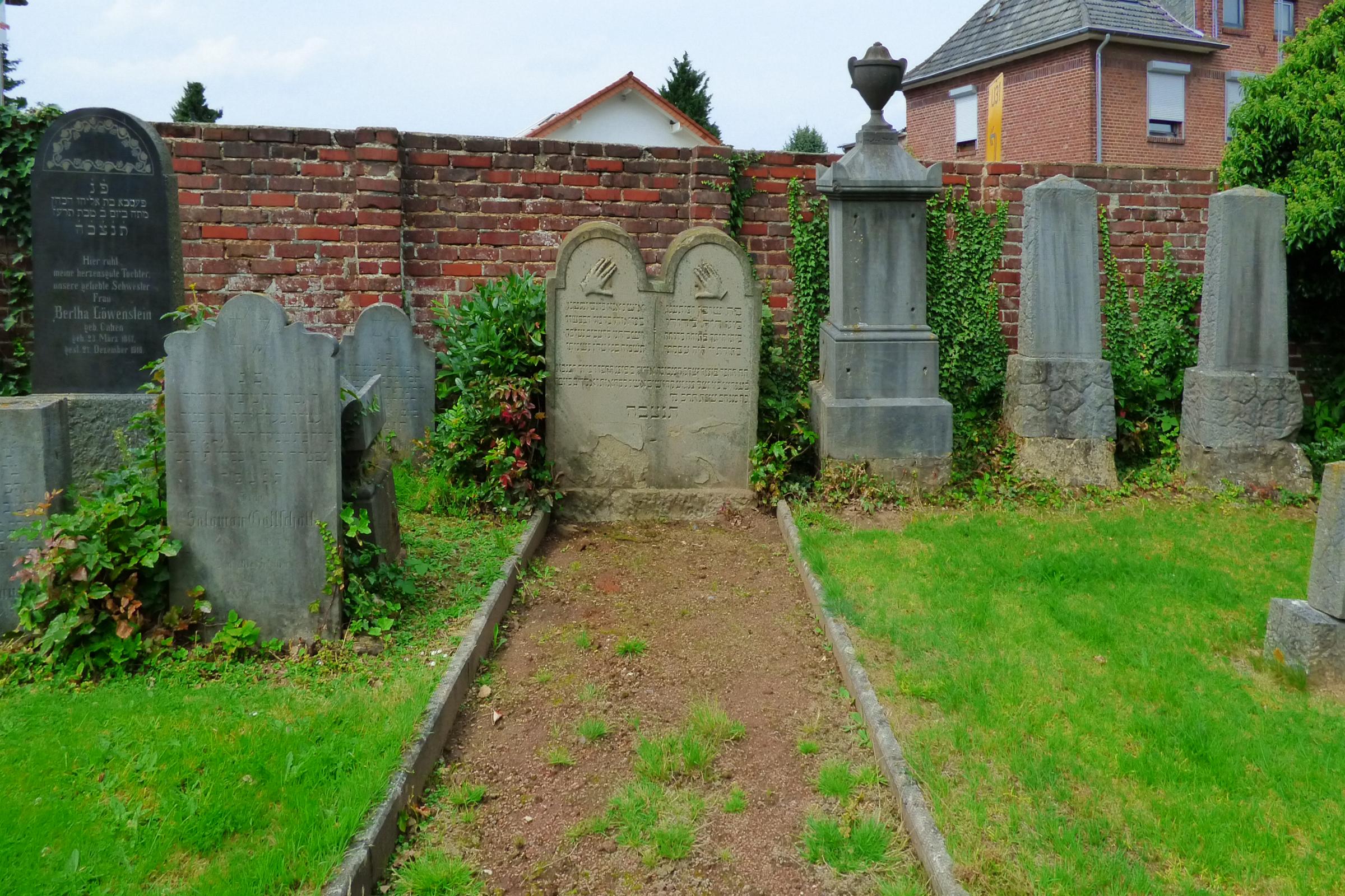Standort: Der Jüdische Friedhof befindet sich an der Heinsberger Straße Ecke An der Linde, in der Stadt Geilenkirchen. Er steht mit der Nr. 13 in der Denkmalliste der Stadt Geilenkirchen unter Denkmalschutz. Beschreibung: Auf dem Jüdischen Friedhof in Geilenkirchen befinden sich 117 gut erhaltene Grabsteile. Der Begräbnisplatz wurde 1823 angelegt und bis 1937 genutzt. Er ist mit einer Mauer umgeben. Der Begräbnisplatz, der die NS - Zeit relativ gut überstanden hat, ist in den 60er Jahren dreimal geschändet worden. Quellenhinweis * Denkmalliste Geilenkirchen, Nr. 13, Eintrag vom 16. März 1983 * Jüdischer Begräbnisplatz in Geilenkirchen (Uni-Heidelberg) |