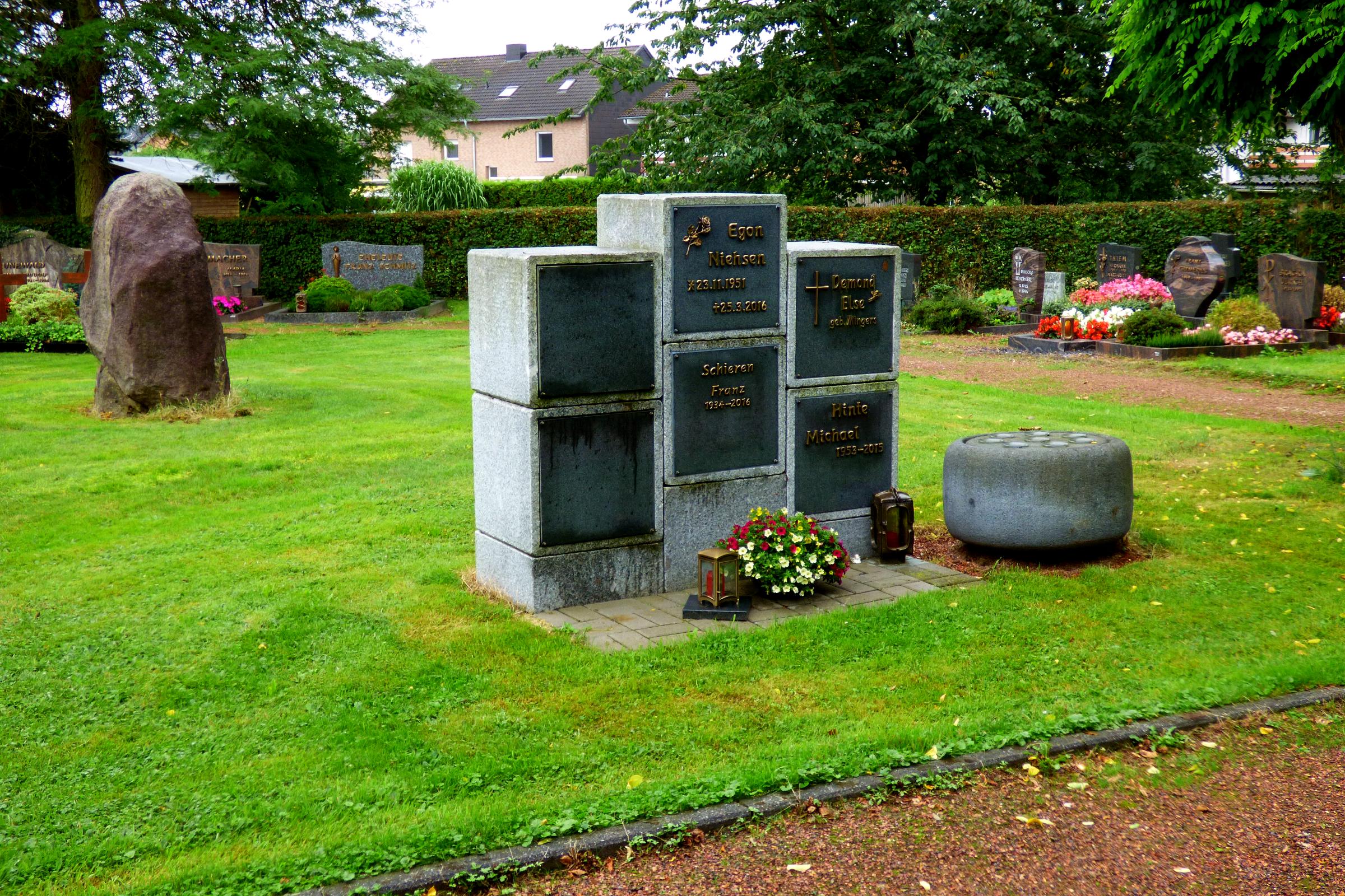 Standort: Das Kolumbarium befindet sich auf dem Friedhof an der Corneliusstraße 37, im Stadtteil Gillrath, in der Stadt Geilenkirchen. Es ist Bestandteil der Friedhofanlage. Beschreibung: Bei dem Kolumbarium handelt es sich um Grabkammern, die zur Aufnahme und Aufbewahren von Urnen dienen. Ähnlich wie in südlichen Ländern werden Kolumbarien auch auf unserer Friedhöfen ein zunehmender Bestandteil der Begräbniskultur. |