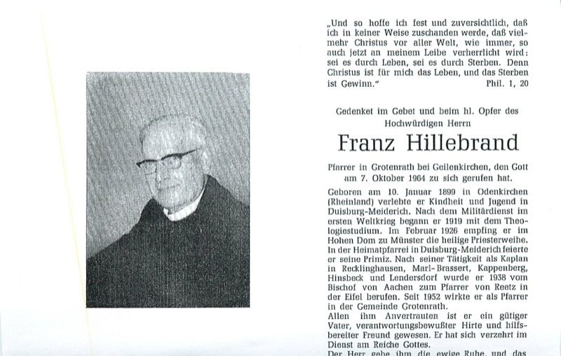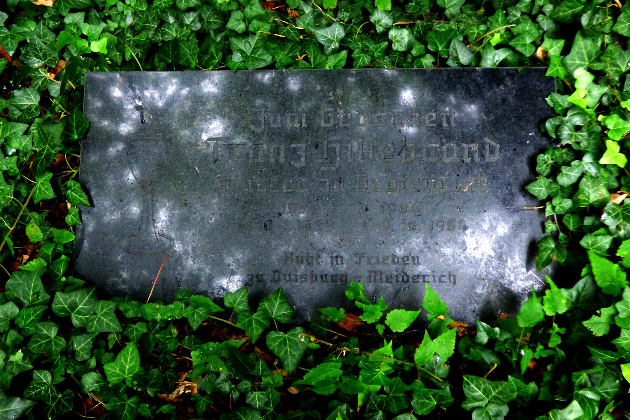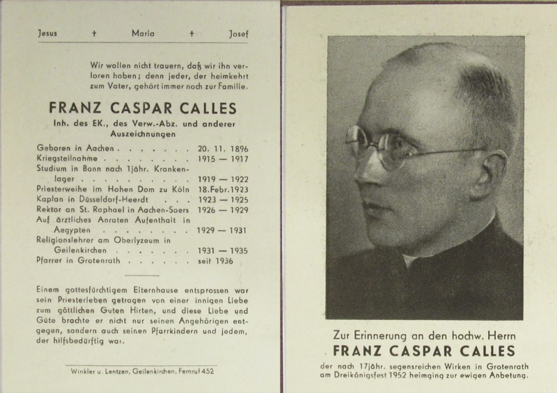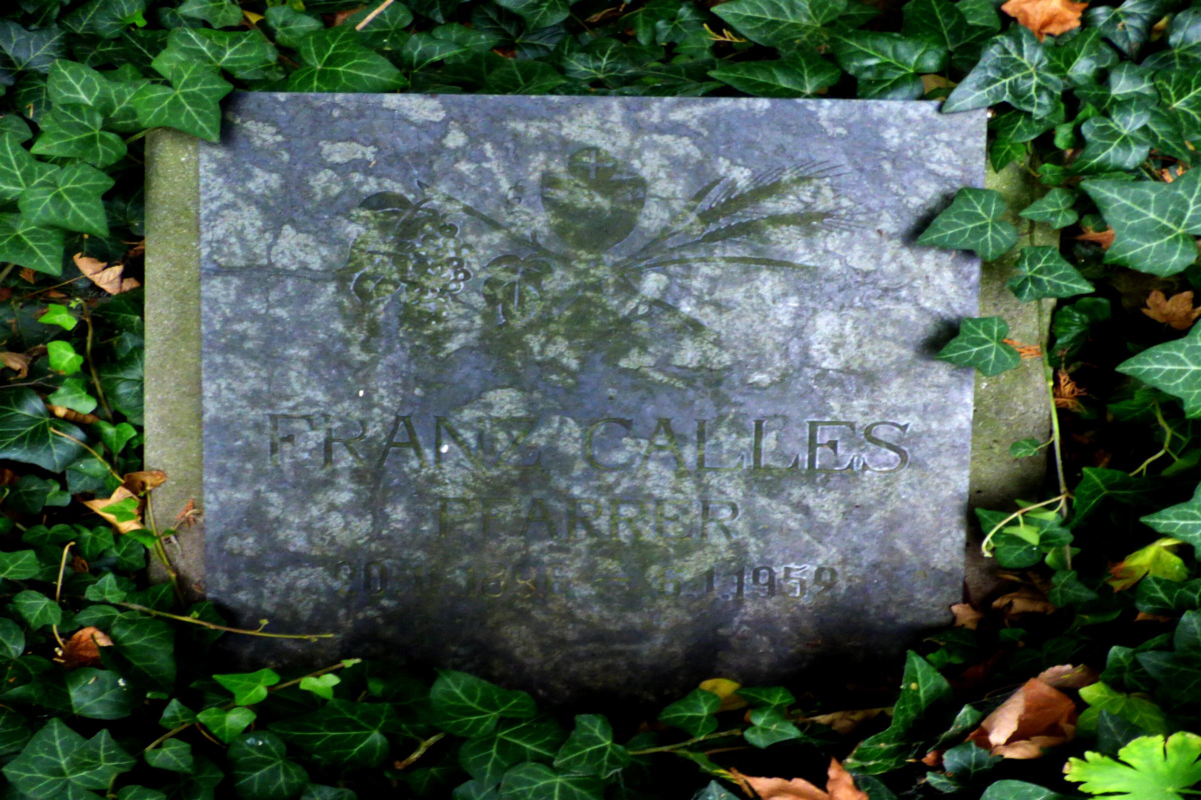 Grabplatte Pfarrer Franz Caspar Calles Grabplatte Pfarrer Franz Hillebrand Standort: Die Priestergrabstätten befindet sich auf dem Friedhof an der Corneliusstraße 37, im Stadtteil Grotenrath, in der Stadt Geilenkirchen. Beschreibung: Bei dem Priestergräbern handelt es sich um die Pfarrer Franz Caspar Calles und Pfarrer Franz Hillebrand. Die Priestergräber sind Bestandteil der Friedhofanlage. Information: * Totenzettel von Pfarrer Franz Caspar Calles (Totenzettelsammlung Westdeutsche Gesellschaft) * Totenzettel von Pfarrer Franz Hillebrand (Totenzettelsammlung Westdeutsche Gesellschaft) |