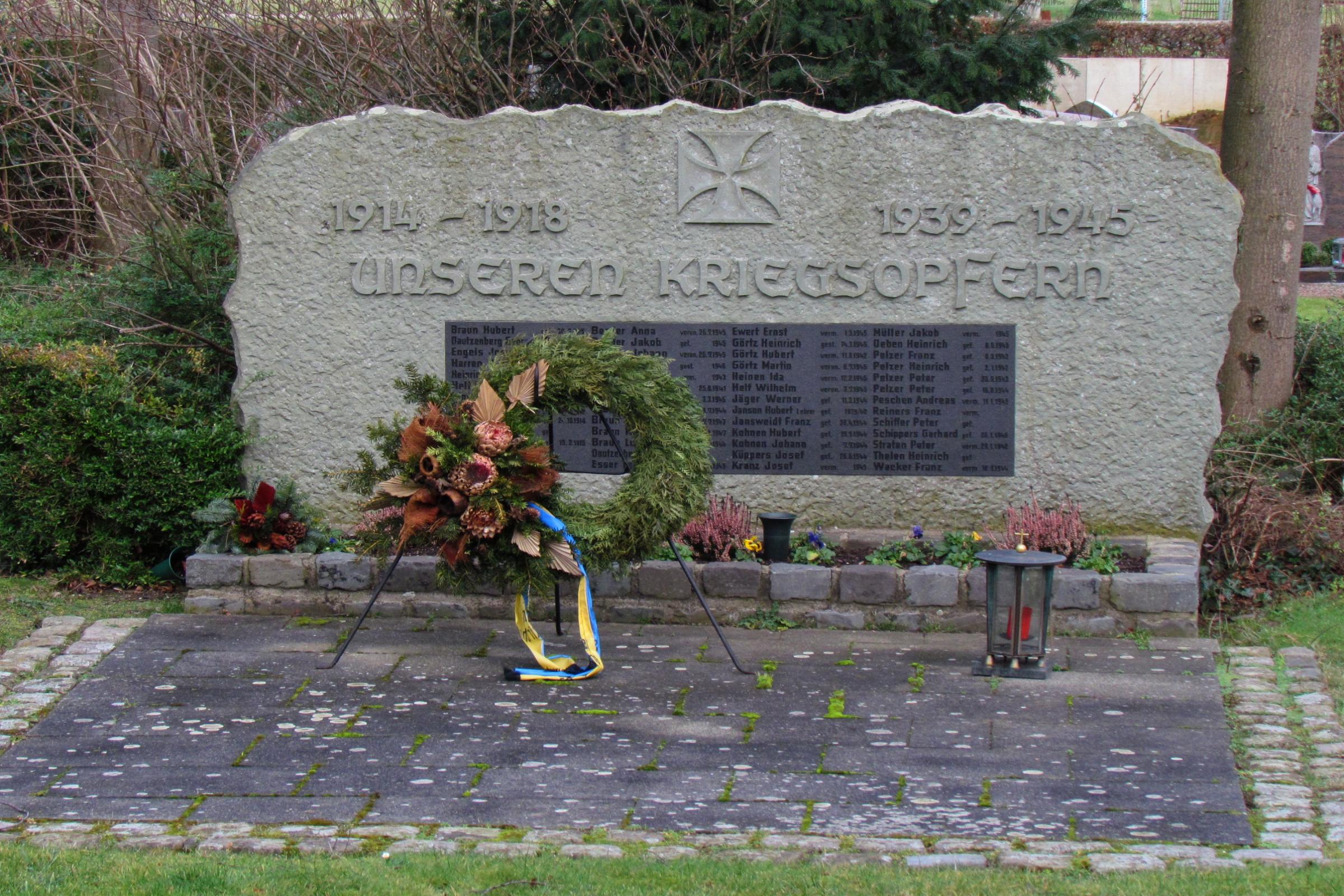 Standort: Das Ehrenmal befindet sich an der Kirche, im Stadtteil Kraudorf, in der Stadt Geilenkirchen. Das Ehrenmal ist Bestandteil der Friedhofanlage. Beschreibung: Das Ehrenmal in Kraudorf wurde zu Ehren der Gefallenen und der Vermißten des Ersten und Zweiten Weltkrieges errichtet. Es soll den Überlebenden zur Mahnung und den Verstorbenen zur Ehre dienen. Die Inschrift lauter: 1914 - 1918 U N S E R E N K R I E G S O P F E R N 1939 - 1945 Quellenhinweis: * Gefallenendenkmal in Kraudorf (Onlineobjekt Gefallenendenkmäler) * Kriegsgräberstätte in Kraudorf (Volksbund Deutsche Kriegsgräberfürsorge e.V.)