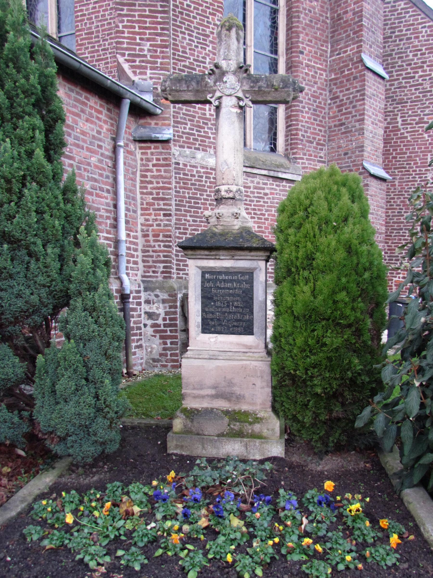 Standort: Das Bürgermeistergrab Krahe hat seinen Standort auf dem ehemaligen Friedhof an der Kirche, im Stadtteil Prummern, in der Stadt Geilenkirchen. Beschreibung: Bei dem Bürgermeistergrab handelt es sich um eine Historische Grabstätte der Eheleute Krahe zu Prummern. Hier ruhen in Gott Joh. Adam Krahe Bürgermeister in Prummern * 1825 + 1892 und seine Ehefrau Anna Barbara Krahe geb. Vequeray * 1827 + 1893 Quellenhinweis: * Johann Adam Krahe v. K. Koch S. 69 1100 Jahre Prummern, Vereinigte Ortsvereine Prummern e V.