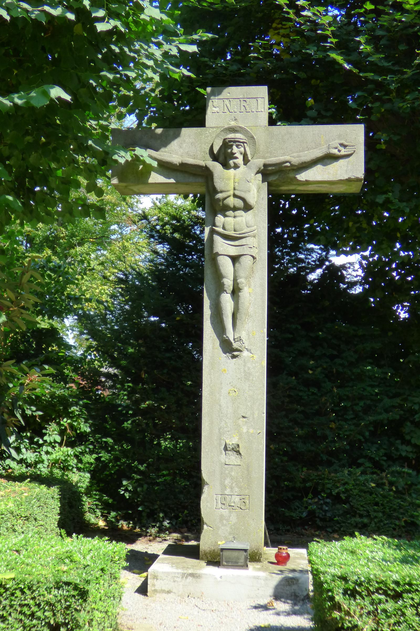 Standort: Das Friedhofskreuz befindet sich in der Nähe des Ehrenfriedhofs auf dem Friedhof am Immendorfer Weg, im Stadtteil Prummern, in der Stadt Geilenkirchen. Beschreibung: Bei dem Friedhofskreuz handelt es sich um ein ca. 4,50 m hohes Steinkreuz mit einem Korpus als Relief, das zugleich auch als Ehrenmal dient. Am unteren Ende des Kreuzes steht die Jahreszahl 1943. Das Kreuz ist Bestandteil der Friedhofanlage. Auf der Rückseite des Kreuzes stehen die Namen der Pfarrer in Prummern von 1662 - 1972