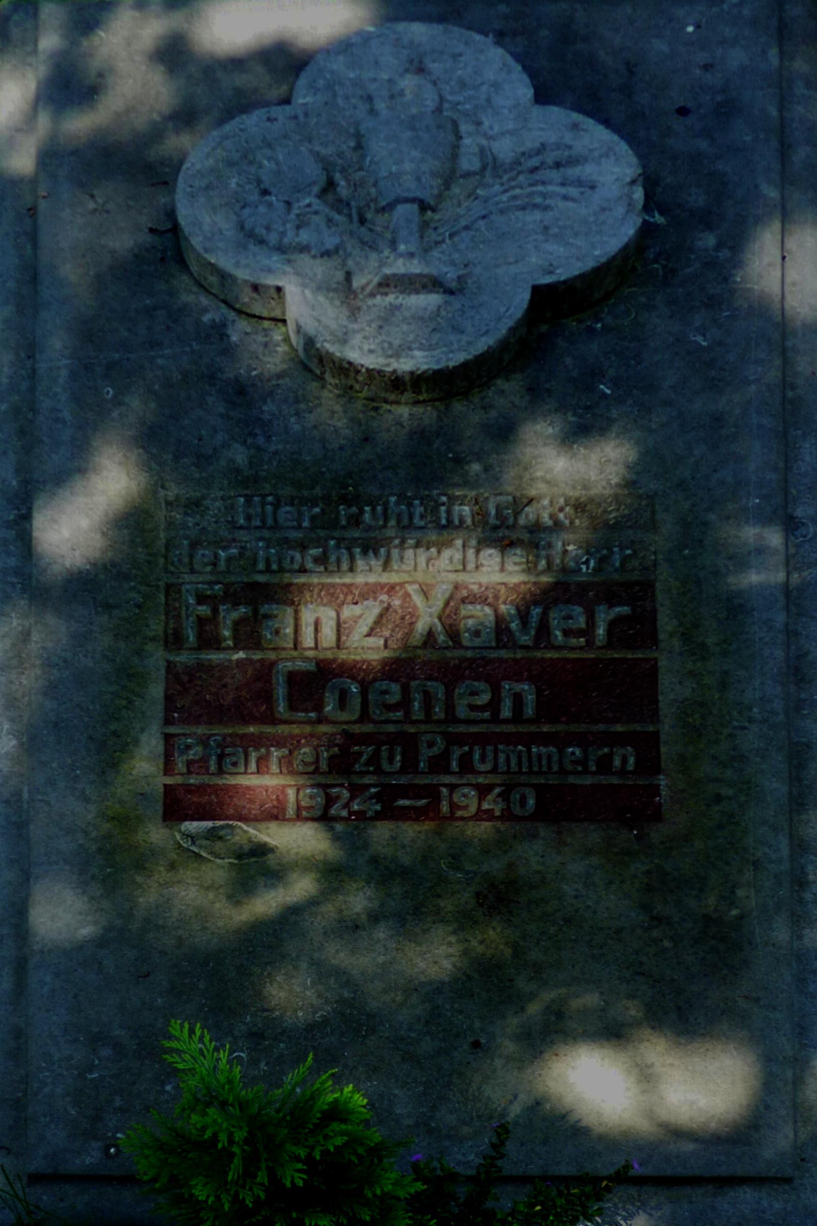 Standort: Das Priestergrab befindet sich in der Nähe des Friedhofkreuzes auf dem Friedhof am Immendorfer Weg, im Stadtteil Prummern, in der Stadt Geilenkirchen. Beschreibung: Das Priestergrab von Pfarrer Franz Xaver Coenen ist mit einer Steinplatte bedeckt. Es ist Bestandteil der Friedhofanlage. Die Inschrift auf der Steinplatte lautet: Hier ruht in Gott der hochwürdige Herr Franz Xaver Coenen Pfarrer zu Prummern 1924 - 1940 Totenzettel von Franz Xaver Coenen (Westdeutsche Gesellschaft)