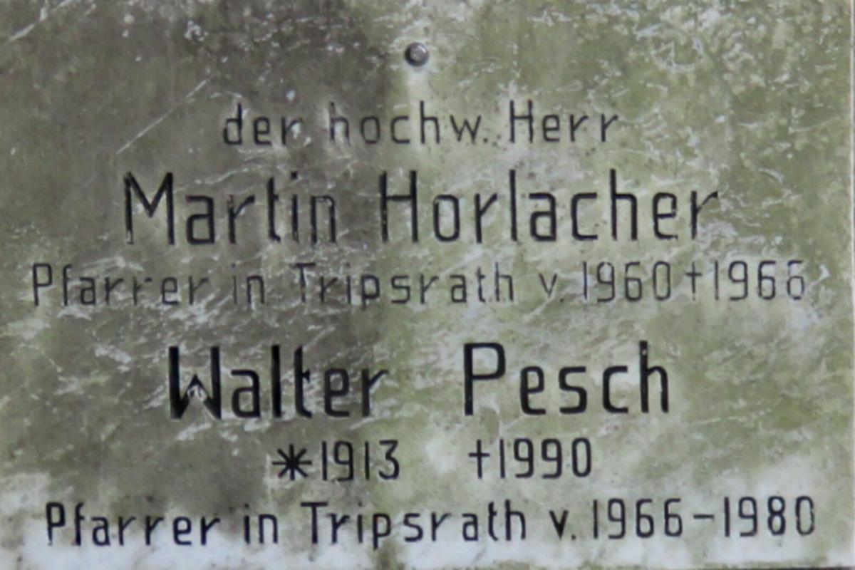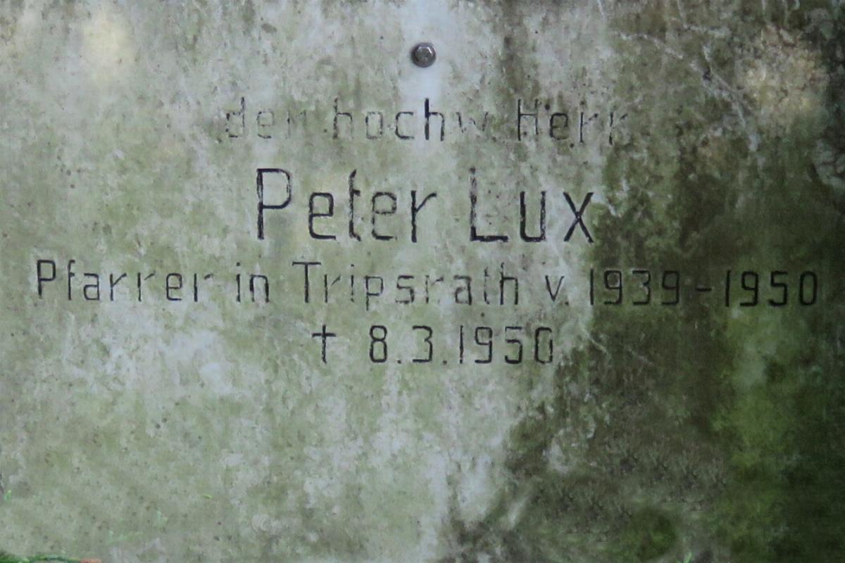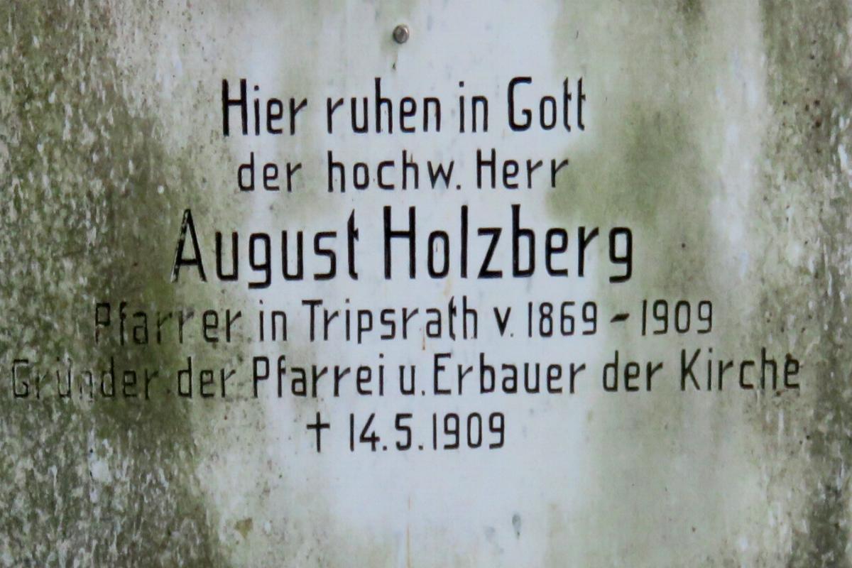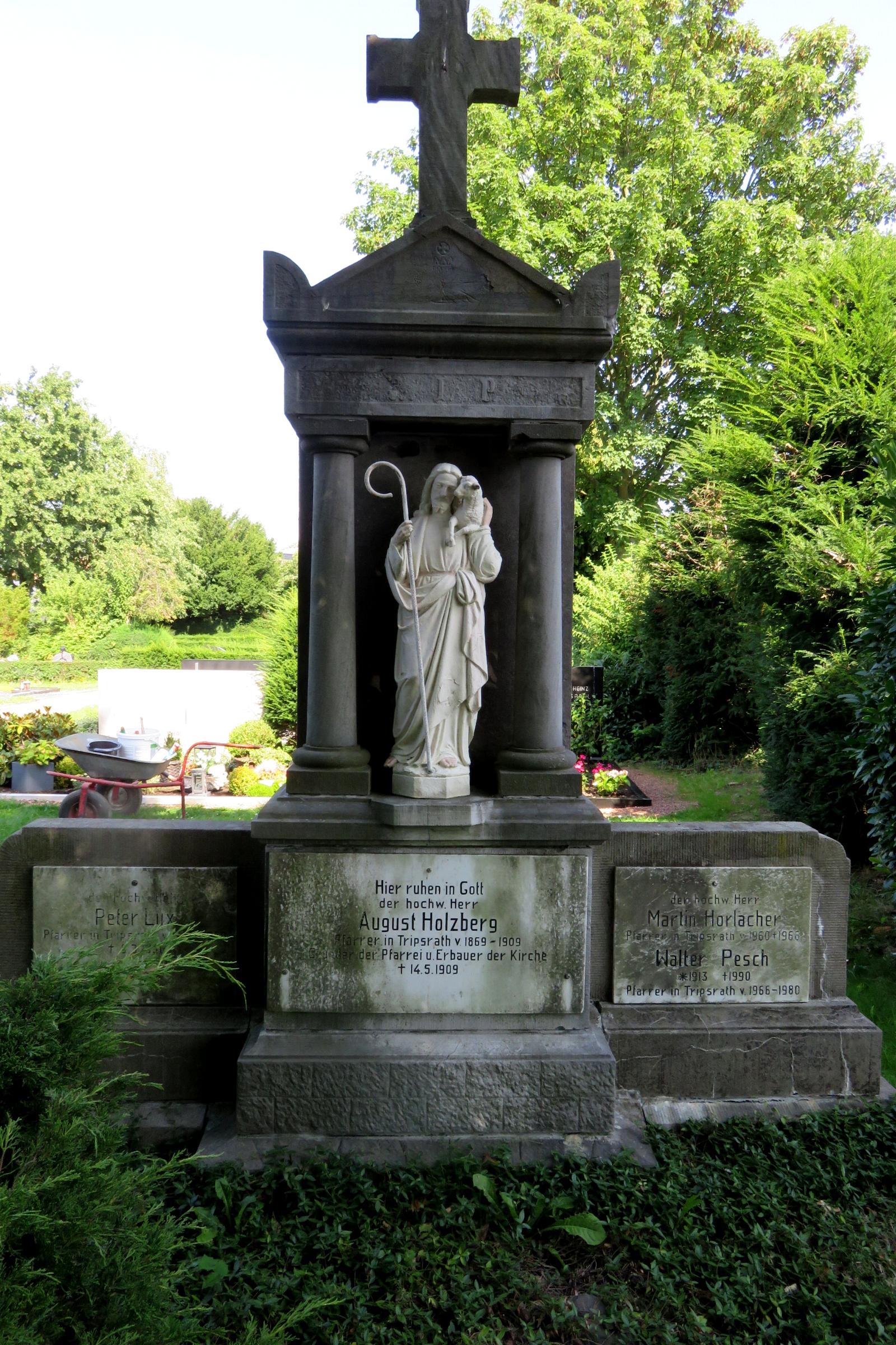 Standort: Die Priestergrabstätte befindet sich in der Nähe des Friedhofskreuzes auf dem Friedhof an der Pfarrer Holzberg Straße 12, im Stadtteil Tripsrath, in der Stadt Geilenkirchen. Beschreibung: Bei der Priestergrabstätte handelt es sich um ein ca. 3,00 m hohes Steinkreuz mit der Figur des Guten Hirten und drei Namenstafeln im Sockelbereich. Die Grabstätten sind Bestandteil der Friedhofanlage. Die hier beerdigten Pfarrer von Tripsrath Pfarrer August Holzberg 1869 - 1909 (Totenzettel) (Westdeutsche Gesellschaft) (Gründer der Pfarrei und Erbauer der Kirche) Pfarrer Peter Lux 1939 - 1950 (Totenzettel) (Westdeutsche Gesellschaft) Pfarrer Martin Horlacher 1960 - 1966 (Totenzettel) (Westdeutsche Gesellschaft) Pfarrer Walter Pesch 1966 - 1980