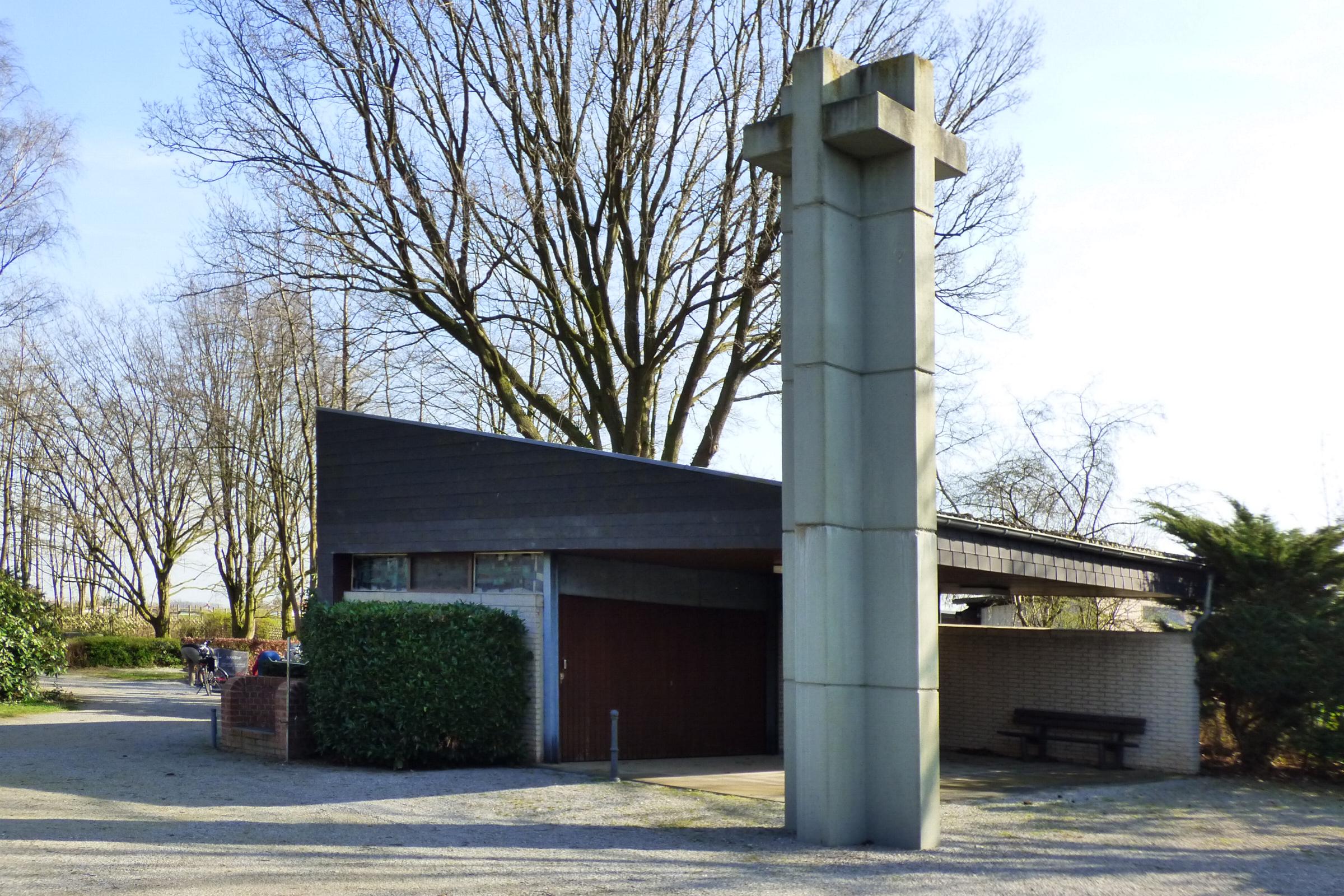 Standort: Die Friedhofshalle befindet sich auf dem Friedhof an der Zedernstraße, im Stadtteil Porselen in der Stadt Heinsberg. Sie ist Bestandteil der Friedhofanlage. |