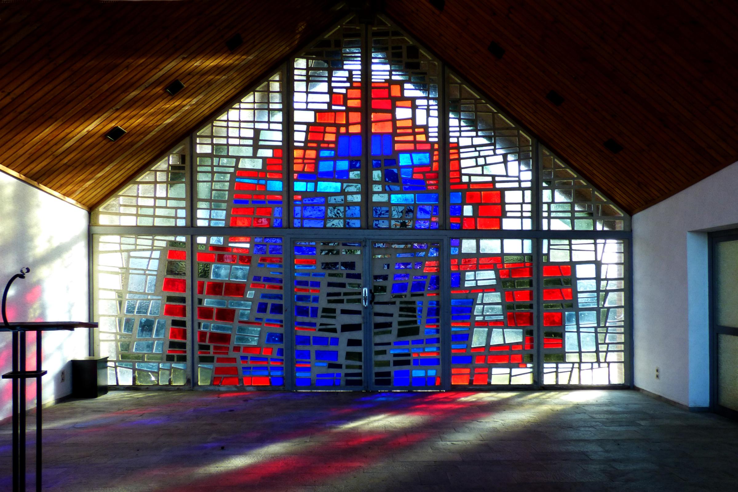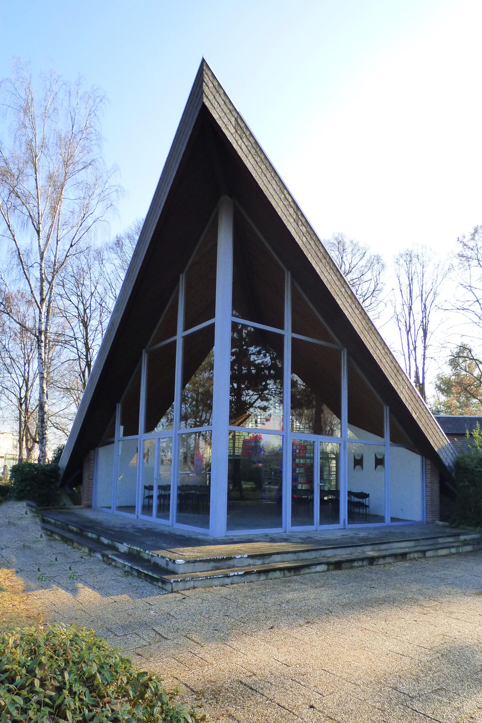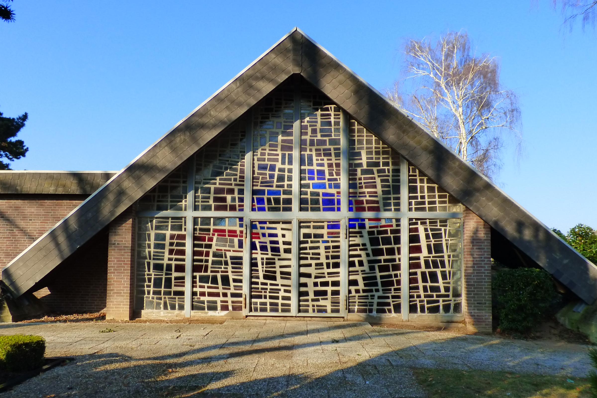 Standort: Die Friedhofshalle befindet sich auf dem Friedhof an der Neustraße 92 in Brachelen, in der Stadt Hückelhoven. Beschreibung: Bei der Friedhofshalle handelt es sich um einen Hallenbau mit einem tief herabgezogenen Satteldach das spitz ausläuft. Die Friedhofshalle mit einer Buntverglasung ist Bestandteil der Friedhofanlage. Info: * Die Friedhofshalle besitzt eine Buntverglasung