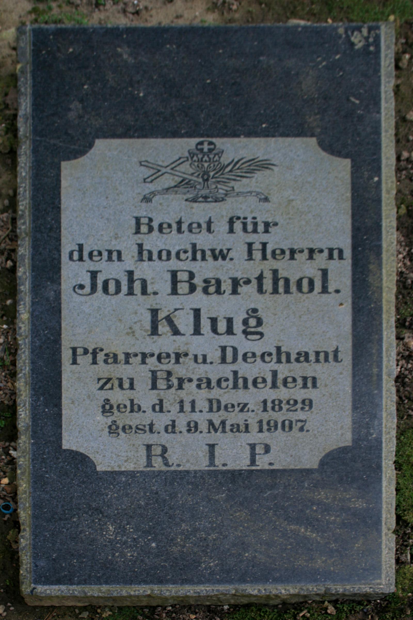 Standort: Die Priestergräber befindet sich auf dem alten Kirchhof an der Kiirchgrabenstraße in Brachelen, in der Stadt Hückelhoven. Beschreibung: Es handelt sich um zwei Grabplatten der Pfarrer Joh. Barthol. Klug und Pfarrer Peter Berrenberg