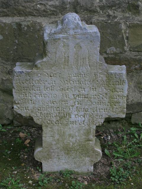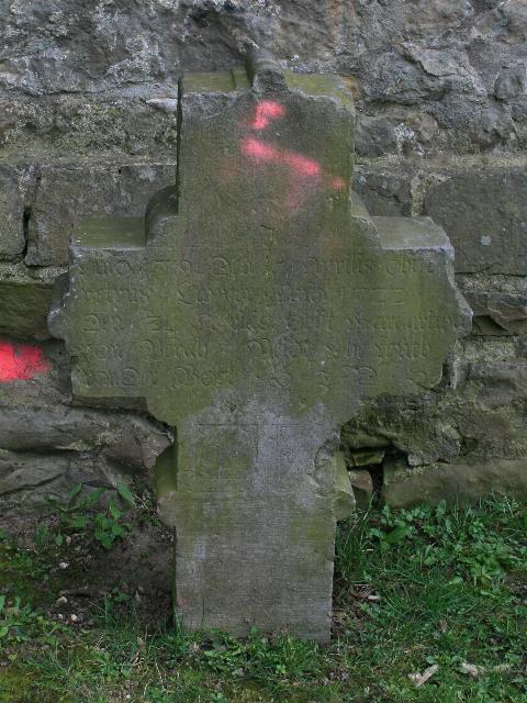 fen. Darunter Scharrur. Kreuz Nr. 3 Barockes Blausteinkreuz von 1780 mit Relief: Gekreuzigter; Zwickel mit Inschrift: AO 1780 DEN 19TEN 7BRIS STARB DER WOHNACHTBARER JOHANNES GANSZEN AM CREUTZ GEWESENER SCHULSTES ZU OBERHOIF SCHEIFEN IN DER HOMBUSCHER LORBANCK IN DER CORFÜRST LORBANCK VORSTEHER ZU DOFFEN IN ZWEYDER EHE MIT CATH TRIST 10 JAHR SEI Kreuz Nr. 4 Barockes Blausteinkreuz von 1631 mit Relief: IHS im Kranz