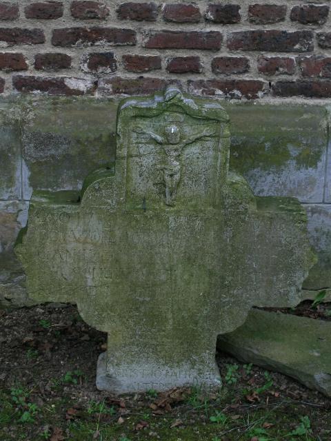 der Bohl H.T.D.S. Darunter zwei Reliefs mit Stundenglas und Scharrur. Kreuz Nr. 2 Barockes Blausteinkreuz von 1629 mit Relief: Kreuzigung mit Maria und Johannes Inschrift: ALo 1629 den 5. Yulius ist der Ehrbahren Meinarth Luberath .enerelen 1os Scheffen zu Hogen bristburtig zu Immerodt rät ... gewesen zu Douveren sein Hausfrau Helena Urnal Ehlendlyst gott den Herrn Entschlaf-