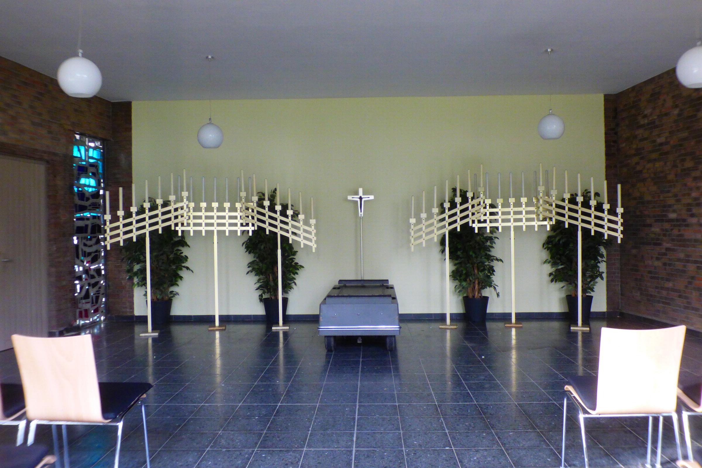 Standort: Die Friedhofshalle befindet sich auf dem Friedhof an der Breite Straße 170, im Stadtteil Hilfarth, in der Stadt Hückelhoven. Sie ist Bestandteil der Friedhofanlage. Beschreibung: Die Friedhofshalle ist ein Gebäude mit einer Glasfassade unter einem Satteldach. Die Halle ist Ausgangspunkt für die Beerdigungen und Beisetzungen auf diesem Friedhof.