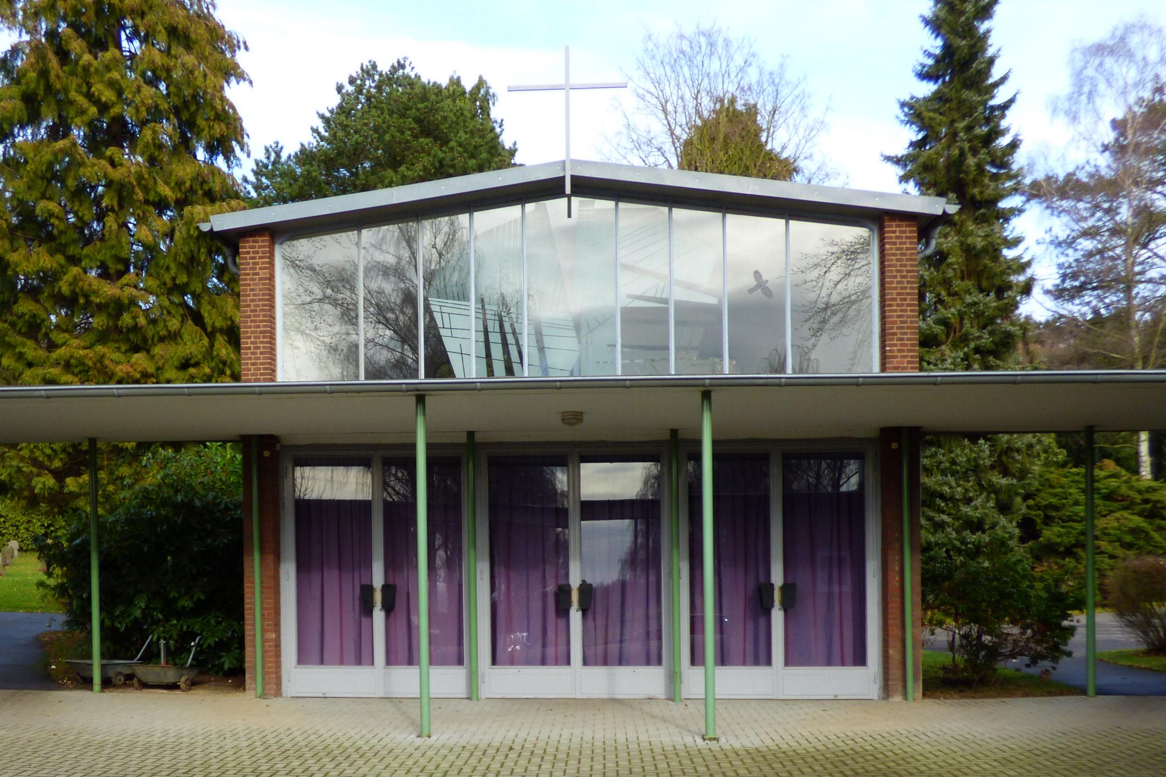 Standort: Die Friedhofshalle befindet sich am Eingang der Friedhofanlage Am Lieberg, in der Stadt Hückelhoven. Beschreibung: DIe Friedhofshalle ist ein hoher Hallenbau mit Glaswänden an der Vor- und Rückseite. Die Friedhofshalle ist Ausgangspunkt aller Beerdigungen und Beisetzungen auf diesem Friedhof. Sie ist Bestandteil der Friedhofanlage.