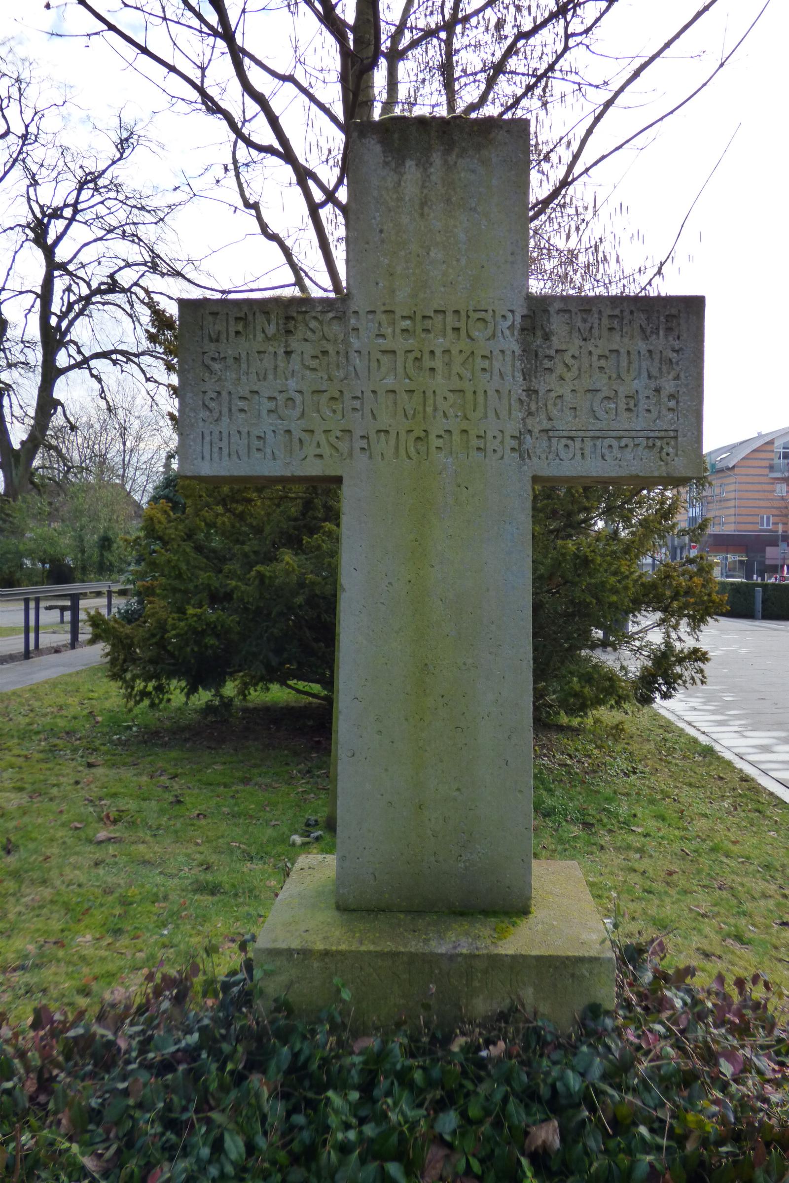 Standort: Das Hochkreuz hat seinen Standort in der Mitte des Schalom - Parks an der Ecke Haagstraße / Parkhofstraße in der Stadt Hückelhoven. Beschreibung: Bei dem Schalom - Park handelt es sich um den ehemaligen Friedhof der evangelischen Kirchengemeinde Hückelhoven. Der Friedhof wurde 1829 erbaut und blieb bis 2005 in seiner Form bestehen. Die erste Beisetzung erfolgte am 18. August 1829, die letzte am 5. Mai 1974. Das Hochkreuz trägt die nachfolgende Inschrift: MEINE