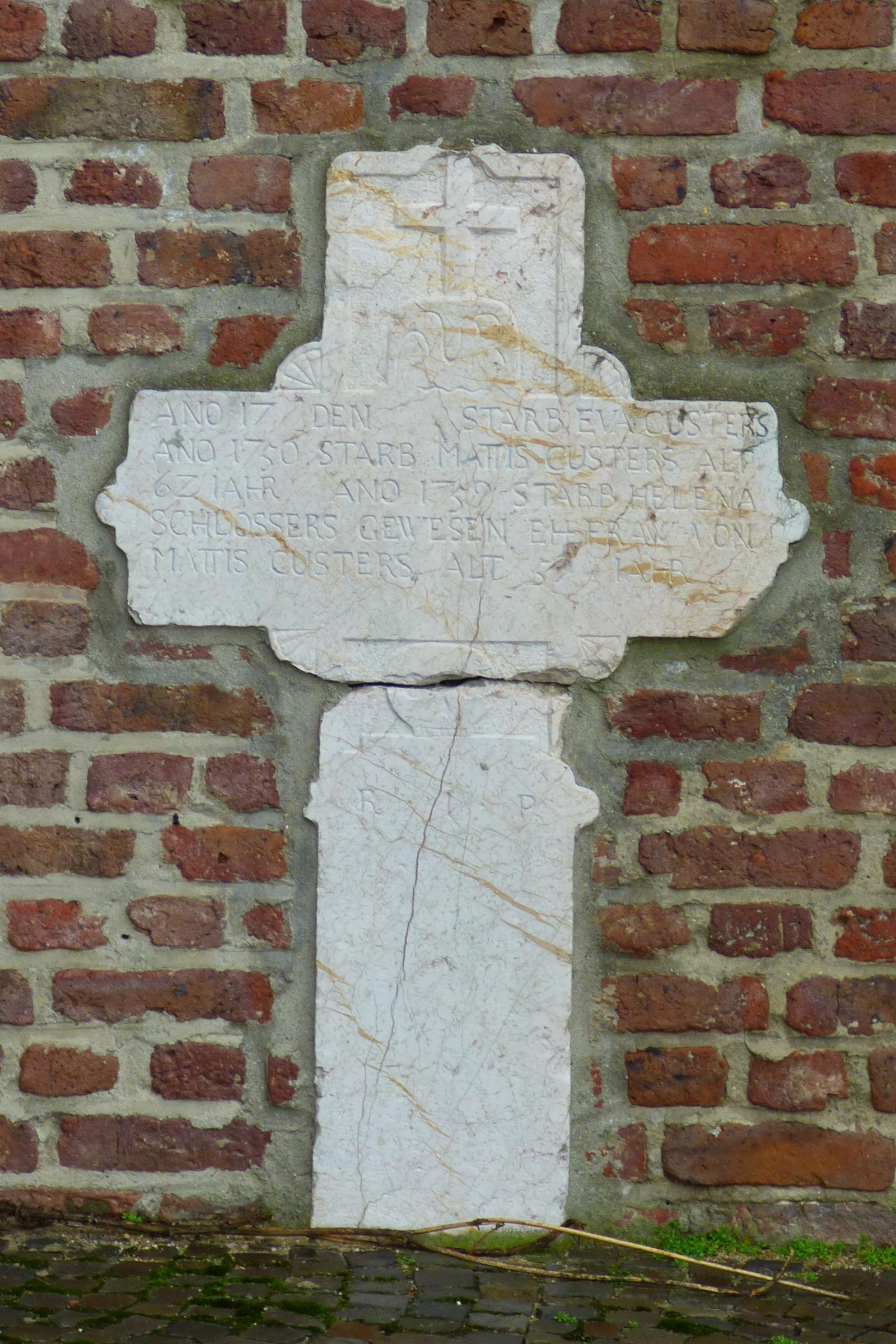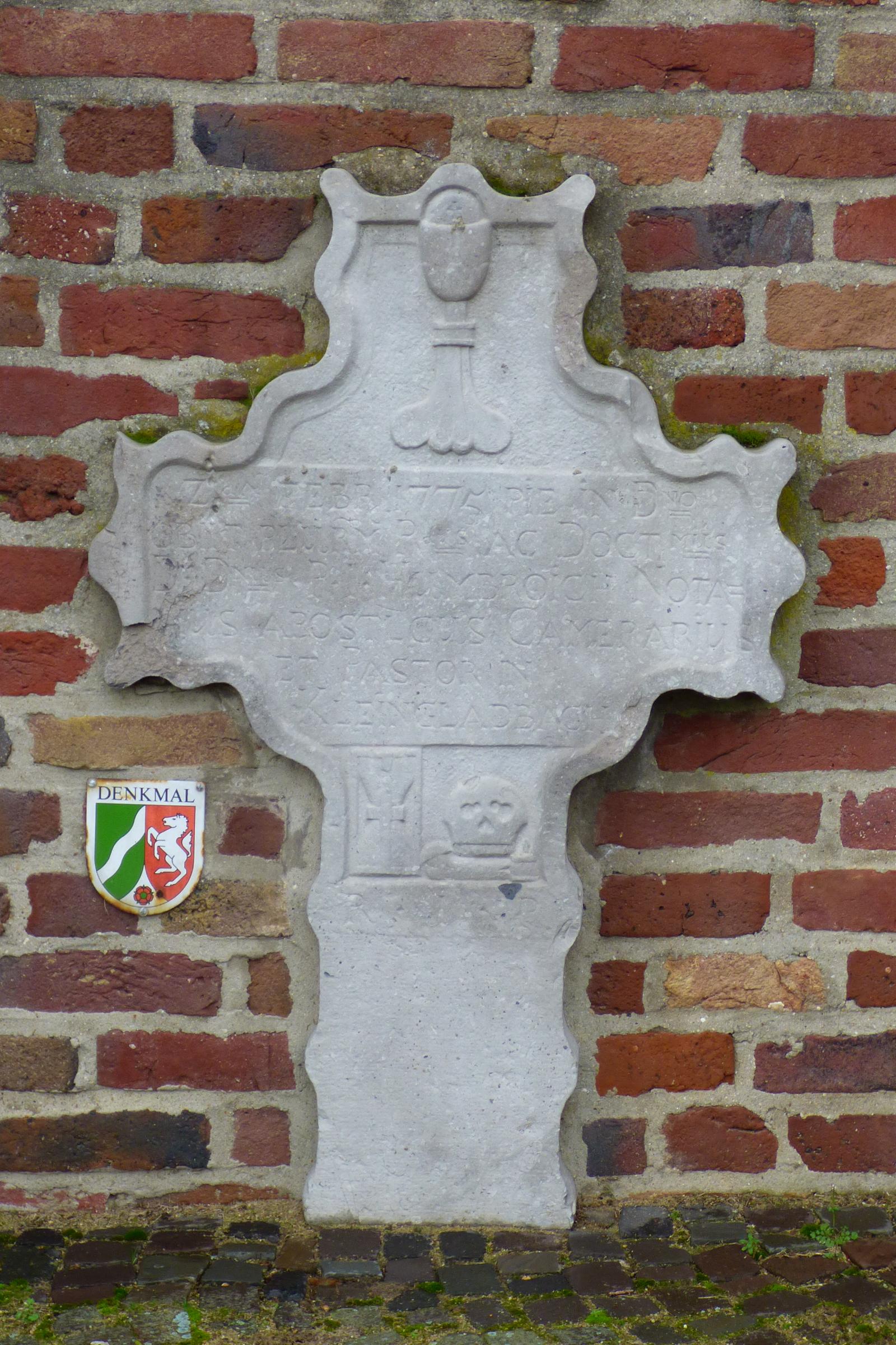 Standort: Die Barockkreuze haben ihren Standort in der Kirchenwand, an der Palandstraße, im Stadtteil Kleingladbach, in der Stadt Hückelhoven. Die Kreuze steht mit der Nr. 100 in der Denkmalliste der Stadt Hückelhoven unter Denkmalschutz. Beschreibung: Es handelt sich um Blausteinkreuze in barocken Formen mit Abendmahlkelch mit Deckel und Kreuz. Darunter eine Inschrift in lateinischer Sprache, die nachweist, das am 2. Februar 1775 der Pastor aus Kleingladbach, Humbroich, verstorben ist. Unter der Inschrift sind eine Sanduhr und ein Totenkopf eingemeißelt sowie die Buchstaben RIP. Quellenhinweis * Denkmalliste Hückelhoven, Nr. 100, Eintrag: 18. März 1988 * Dritte Ausgabe 1994: Handbuch des Bistums Aachen ISBN 3-87448-172-7 S. 775