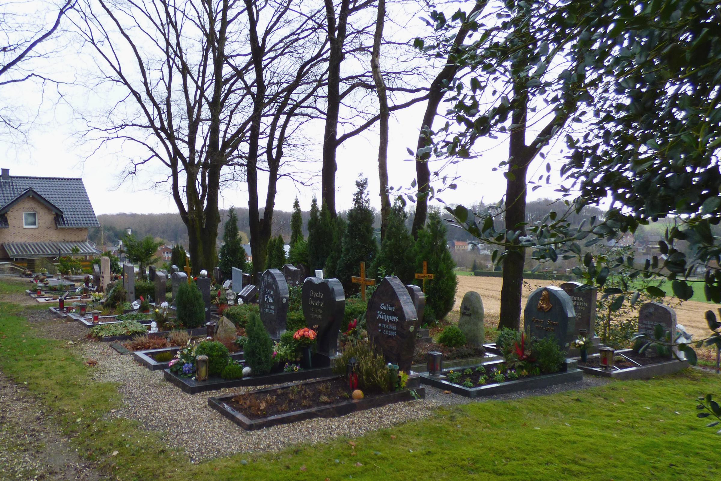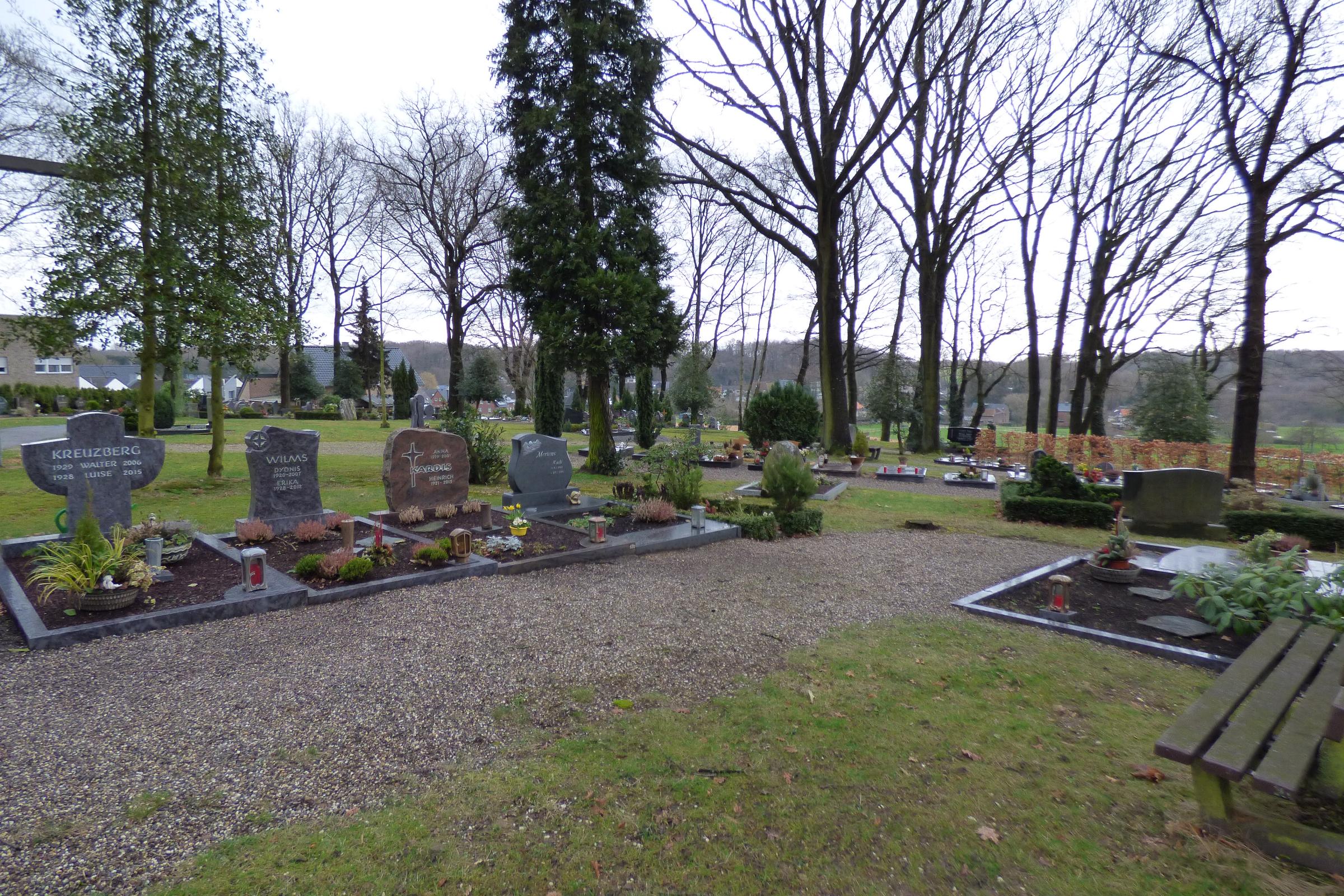 Standort: Die neue Friedhofanlage befindet sich am Palmweg im Stadtteil Kleingladbach, in der Stadt Hückelhoven. Zur Friedhofanlage gehören neben den Gräbern die Friedhofshalle und das Hochkreuz. Beschreibung: Die Geschichte der Kirche St. Stephanus geht bis in das 15. bis 16. Jahrhundert zurück. Schon in früher Zeit wurden die Toten auf dem Kirchhof rund um die Kirche beerdigt. Eine Zeitansage ist für Kleingladbach nicht angegeben. Es ist aber überliefert, dass der alte Friedhof früher ca. 90 cm höher als die Kirche lag. So musste man 4 bis 5 Stufen ins Innere der Kirche absteigen. Man trug deshalb im Jahre 1822 den alten Friedhof entsprechend ab, da das Kirchengebäude sehr unter Feuchtigkeit zu leiden hatte. In den fünfziger Jahren entstand im früheren Palmbusch, am Palmweg ein neuer Friedhof. Der alte Friedhof, der sich im Bereich rund um die Kirche befand, wurde Anfang der siebziger Jahre weitgehend eingeebnet. Auf dem Weg zur Kirche befindet sich ein Missionskreuz aus dem Jahre 1747. Einzelne Gräber, Grabmale sowie die beiden Kriegerdenkmale, die an die Gefallenen und Vermissten der Weltkriege 1914 – 1918 und 1939 – 1945 erinnern, ergeben nunmehr eine geschlossene Anlage, deren Mittelpunkt die Pfarrkirche bildet. Quellenhinweis: Geschichtliches über Kleingladbach (Erstellt von Willi Jansen und Peter Reitz - überarbeitet von Friedel Dreßen)
