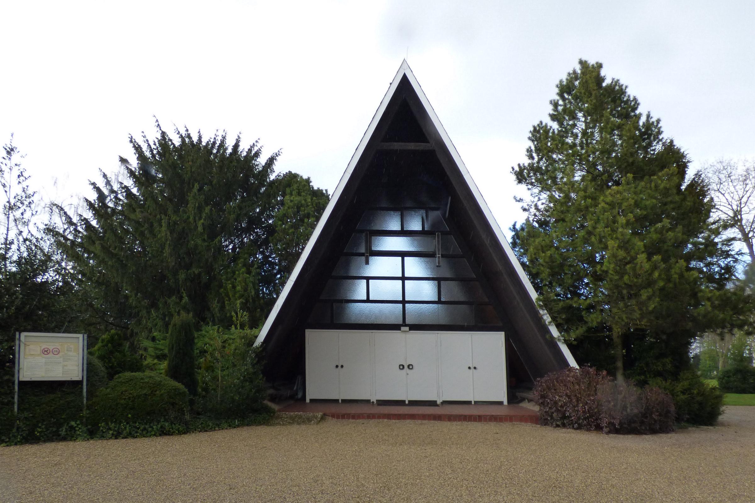 Standort: Die Friedhofshalle befindet sich auf dem Friedhof an der Krickelberger Straße im Stadtteil Ratheim, in der Stadt Hückelhoven. Beschreibung:Die Friedhofshalle ist eine Holzkonstruktion unter einen sehr spitzen Satteldach. Die Halle ist Bestandteil der Friedhofanlage Ratheim.