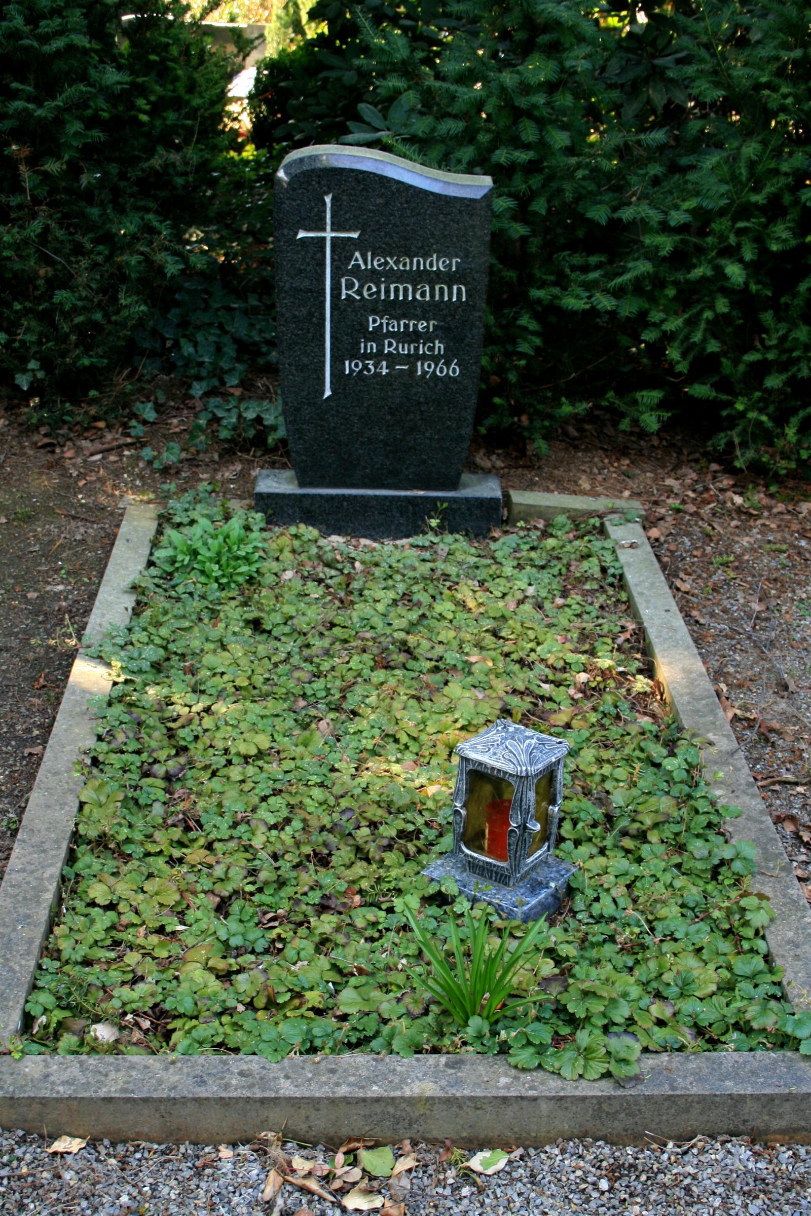 Alexander Reimann Pfarrer in Rurich 1934 - 1966 Standort: Das Priestergrab Reimann befindet sich auf dem Friedhof an der Römerstraße in Rurich, in der Stadt Hückelhoven. Das Priestergrab steht mit der Nr. 112 in der Denkmalliste der Stadt Hückelhoven unter Denkmalschutz. Es ist Bestandteil der Friedhofanlage Rurich. Quellenhinweis: * Denkmalliste Nr. 112 in der Stadt Hückelhoven