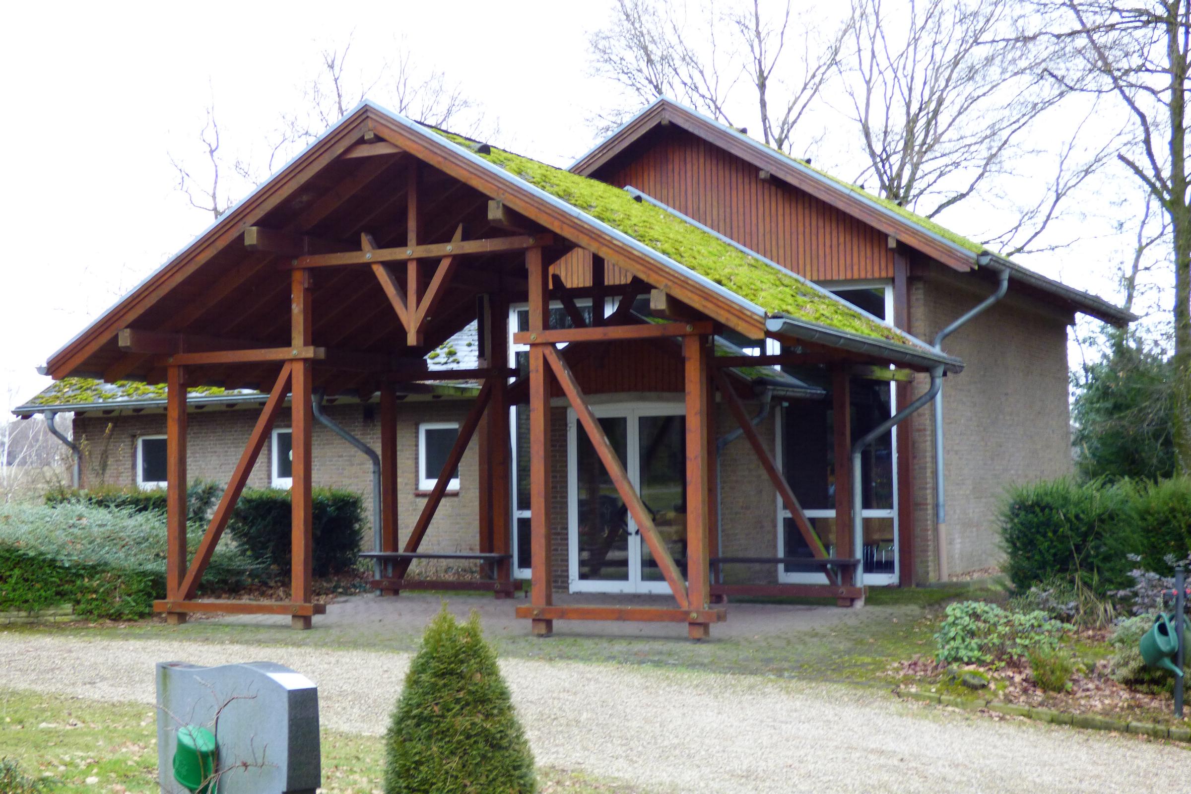 Standort: Die Friedhofshalle befindet sich an der Straße Zur Fuchsfalle 5 in Schaufenberg, in der Stadt Hückelhoven. Beschreibung: Die Friedhofshalle ist eine Kombimation aus einem geschlossenen Hallenbau mit einer davorstehenden überdachten offenen Halle aus Holz. Die Friedhofshalle ist Ausgangspunkt aller Beerdigungen und Beisetzungen aus diesem Friedhof. Die Halle ist Bestandteil der Friedhofanlage.