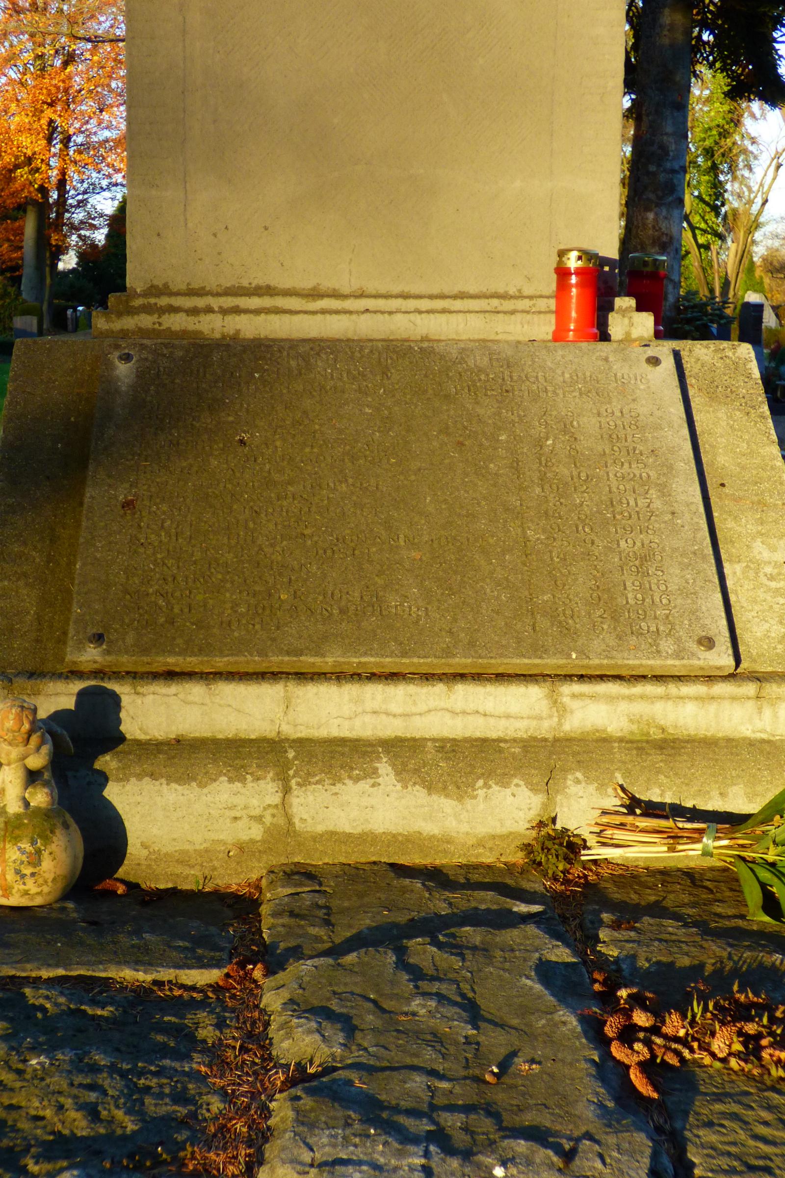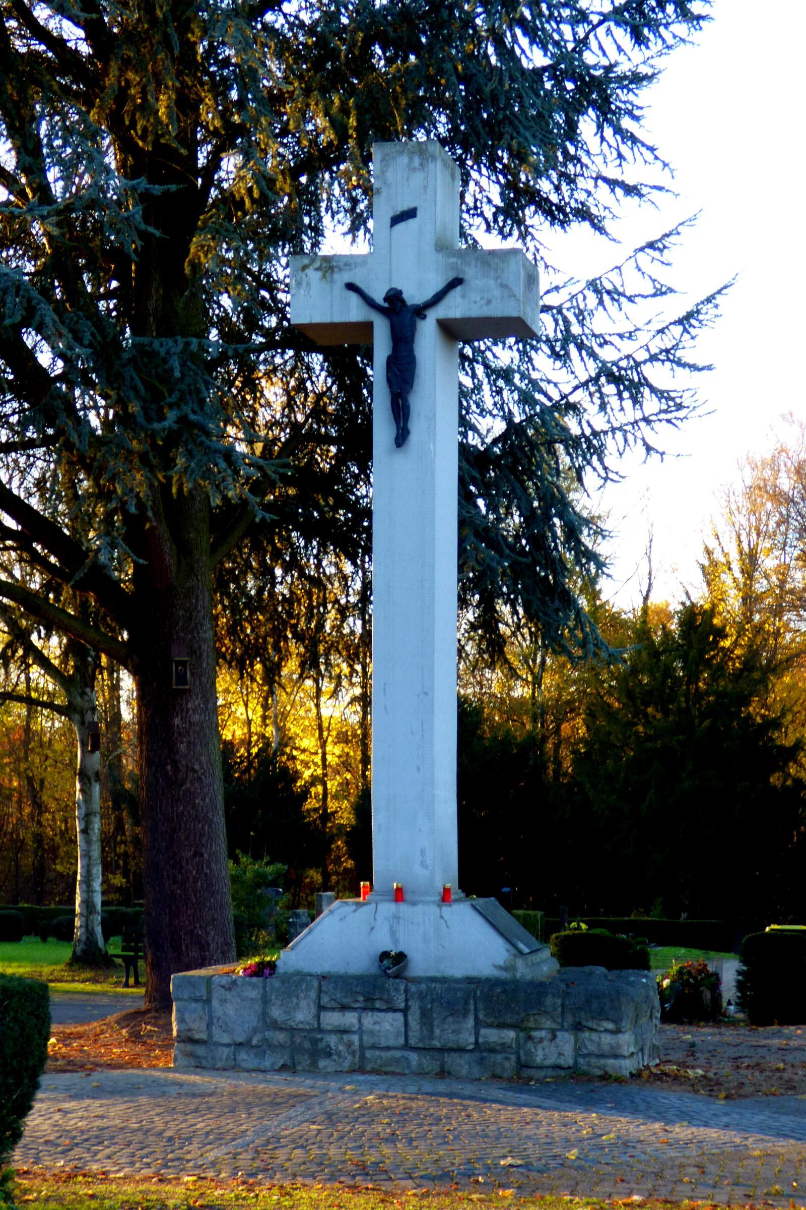 Standort: Das Friedhofskreuz und Ehrenmal befindet sich in zentraler Lage des Friedhofs an der Alte Aachener Straße 45, im Stadtteil Palenberg, in der Stadt Übach-Palenberg. Das Friedhofskreuz und Ehrenmal ist Bestandteil der Friedhofanlage. Beschreibung: Bei dem Friedhofskreuz und Ehrenmal handelt es sich um ein ca. 5,00 m hohes Steinkreuz mit einem Korpus. Am unteren Teil des Kreuzes befinden sich 2 Erinnerungstafeln für die Gefallenen des Weltkrieges 1914 - 1918 Quellenhinweis: * Gefallenendenkmal in Palenberg (Onlineobjekt Gefallenendenkmäler)