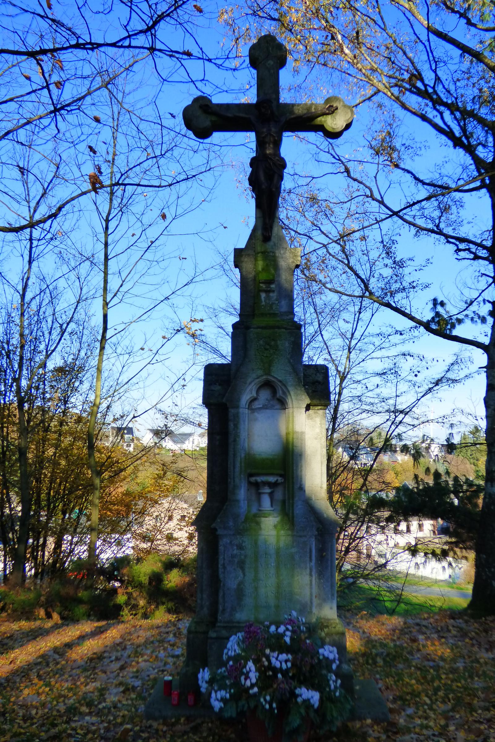 Standort: Das Hochkreuz befindet sich auf dem Kirchhof der Pfarre St. Dionysius, im Stadtteil Übach, in der Stadt Übach-Palenberg. Das Kreuz steht mit der Nr. 23 in der Denkmalliste der Stadt Übach-Palenberg unter Denkmalschutz. Beschreibung: Bei dem Hochkreuz handelt es sich um ein ca. 4,00 m hohes Steinkreuz mit einem Korpus. Auf dem kreuzförmigen Sockel steht die nachfolgende Inschrift: Es ist ein heiliger und heilsamer Gedanke für die Verstorbenen zu beten auf dass sie von ihren Sünden erlöst werden. Denkmalbeschreibung: Das Hochkreuz steht am Rande des Kirchhofes. Das Kreuz hat eine neu romanische Form auf einem kreuzförmigen Sockel mit Inschrift. Errichtet 1885; stand bis Januar 1976 (teilweise Zerstörung durch Sturm) weiter östlich. Wiedererrichtet 1978, mit neuem Bronzekorpus versehen. * Denkmalliste Übach-Palenberg, Nr. 23, Eintrag vom 23. März 1984