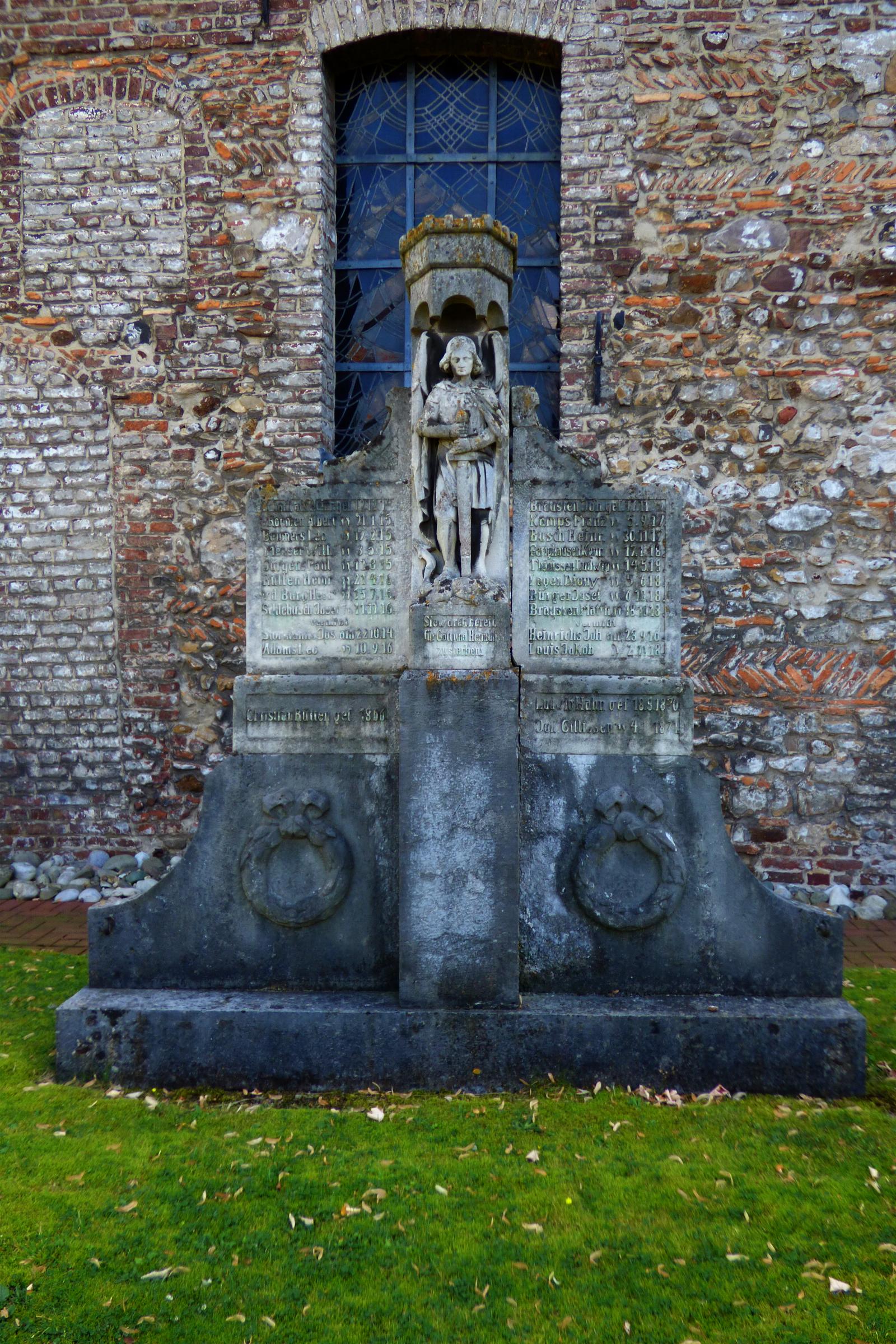 Standort: Das Kriegerdenkmal hat seinen Standort auf dem Kirchhof, an der Kirche St. Martinus, im Stadtteil Orsbeck, in der Stadt Wassenberg. Beschreibung: Das Kriegerdenkmal besteht aus einem Unterteil aus Blaustein und einem Oberteil aus Sandstein, das St. Michael als Drachentöter zeigt. Das Ehrenmal hat eine Höhe von 2,60m, eine Breite von 2,40 m und eine Tiefe von 0,12 m. Auf Tafeln stehen die Namen der Gefallenen und Vermißten von 1866, von 1870 -1871 und 1914 - 1918. Inschrift: Sie waren bereit für Gott und Heimat zu sterben. Quellenhinweis: * Verzeichnis: Christliche Kleindenkmale im Kreis Heinsberg (Orsbeck Nr. 2)