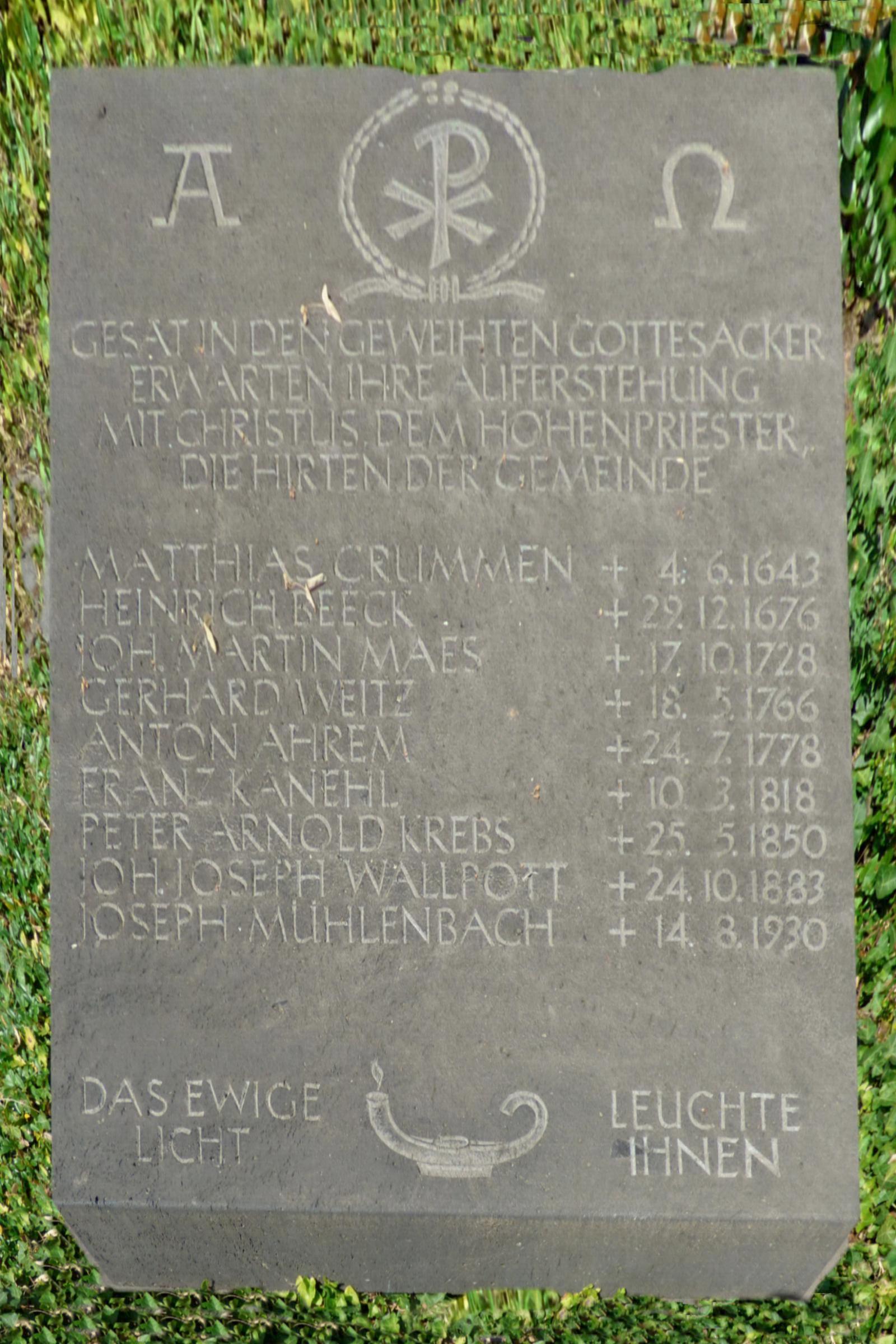 Standort: Das Priesterkreuz, befindet sich an der Pfarrkirche St. Martinus, in Orsbeck, in der Stadt Wassenberg. Geschichte und Architektur: Das Priesterkreuz ist ein Holzkreuz mit einem Korpus an der Südseite der Kirche. Es ist 1,85 m hoch, 1,20 m breit und hat eine Tiefe und Stärke von 0,13 x 0, 18 m. Vor dem Kreuz liegt eine Grabplatte aus Basalt mit den Namen der hier begrabenen Priester von 1643 - 1930. Pastor Mühlenbach ist 1930 auf einer Pilgerreise in Haifa verstorben und wurde auch dort begraben. Quellenhinweis: * Verzeichnis: Christliche Kleindenkmale im Kreis Heinsberg (Orsbeck Nr. 3) * Dritte Ausgabe 1994: Handbuch des Bistums Aachen ISBN 3-87448-172-7 S. 796-799