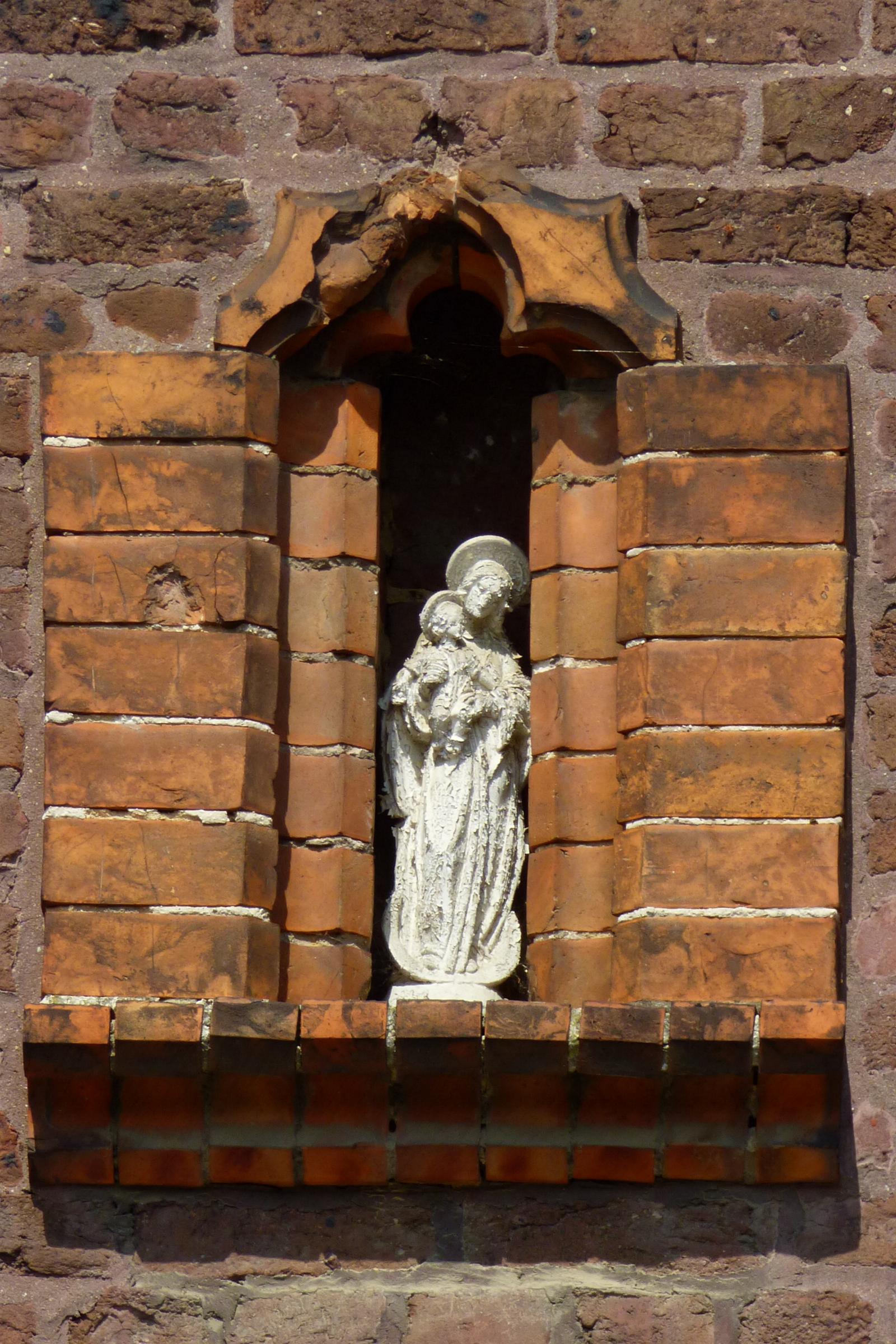 Standort: Die Hausfigur hat ihren Standort in der Buscherheide 32, im Ortsteil Brüxgen, in der Gemeinde Gangelt. Geschichte: Bei der Hausfigur handelt es sich um eine ca. 0,30 m hohe Madonna mit Kind in einer gemauerten Figurennische.