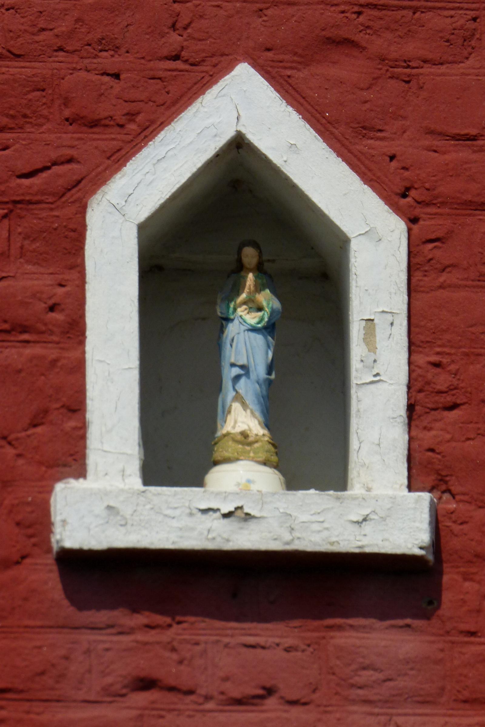 Standort: Die Hausfigur hat ihren Standort in der Buscherheide 38, im Ortsteil Brüxgen, in der Gemeinde Gangelt. Geschichte: Bei der Hausfigur handelt es sich um eine ca. 0,30 m hohe Madonna in einer gemauerten Figurennische.