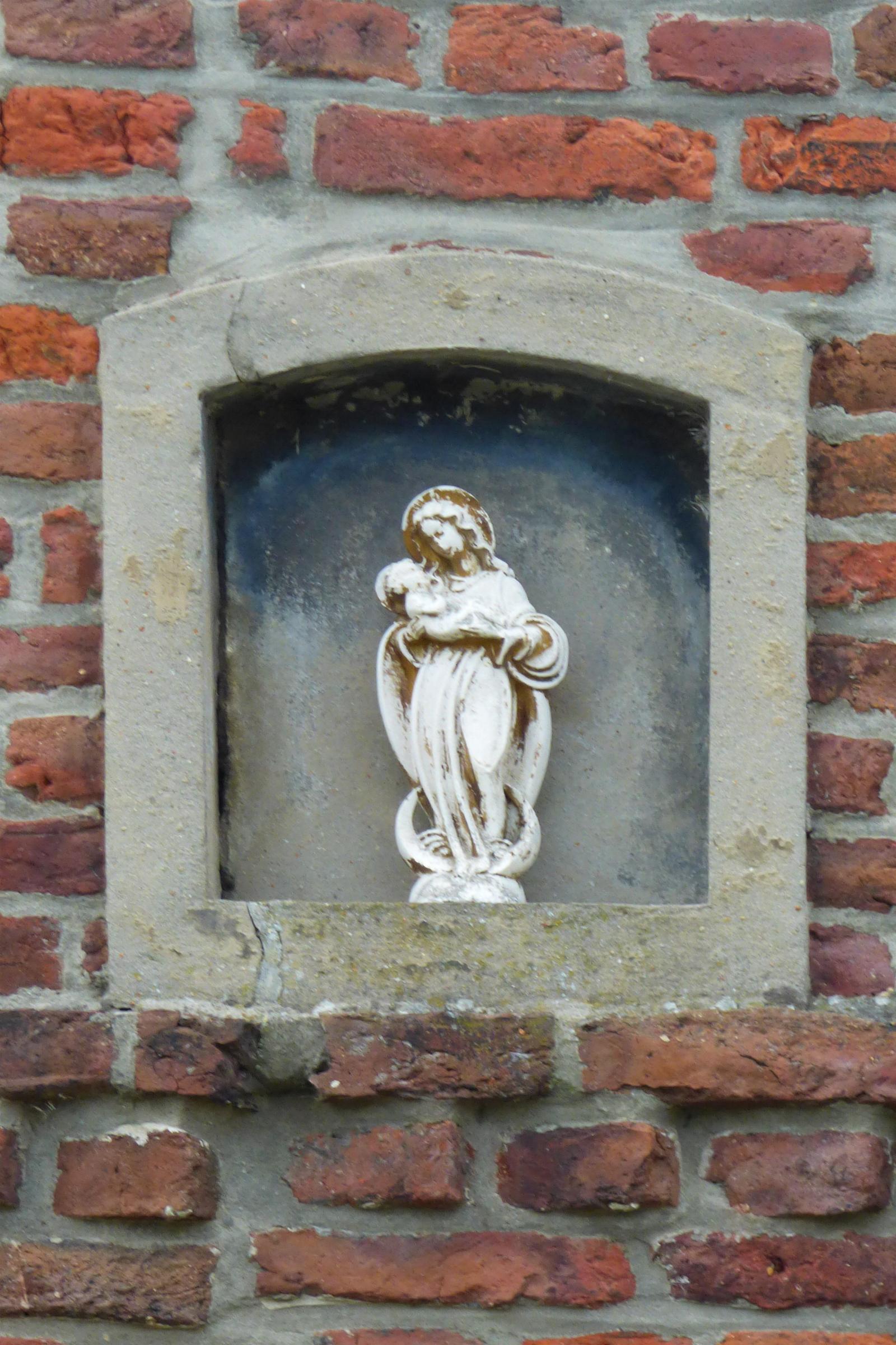 Standort: Die Hausfigur hat ihren Standort Im Heggen 15, im Ortsteil Langbroich, in der Gemeinde Gangelt. Geschichte: Bei der Hausfigur handelt es sich um eine ca. 0,30 m hohe Madonna mit Kind in einer gemauerten Figurennische.