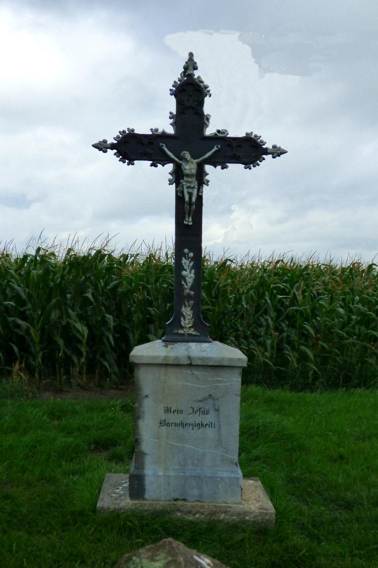 Standort: Das Wegekreuz hat seinen Standort am Grenzweg in der Feldlage, im Stadtteil Grotenrath, in der Stadt Geilenkirchen. Beschreibung: Bei dem Wegekreuz handelt es sich um ein ca. 2,30 m hohes gußeisernes Kreuz mit einem Korpus auf einem Steinsockel. Das Kreuz stammt aus dem 18. Jahrhundert und trägt die Inschrift: Mein Jesus Barmherzigkeit !