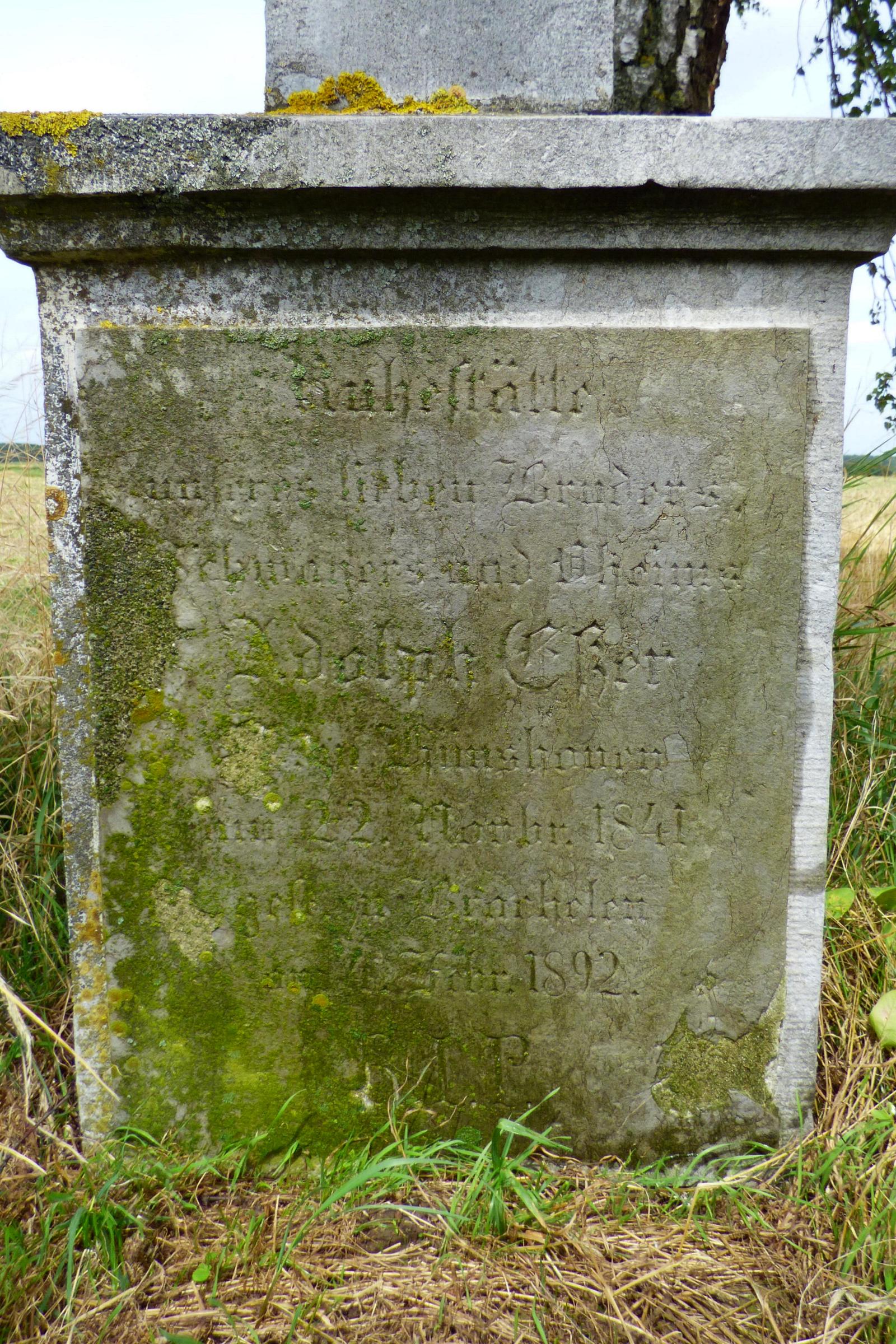 Standort: Das Gedenkkreuz hat seinen Standort am Randerather Weg, im Stadtteil Lindern, in der Stadt Geilenkirchen. Beschreibung: Bei dem Gedenkkreuz handelt es sich um ein ca. 2,00 m hohes Steinkreuz ohne Korpus aus dem 18. Jahrhundert. Das Kreuz befindet sich an der nordöstlichen Stadtgrenze von Geilenkirchen in der Feldgemarkung Weitfeld. Es steht zwischen den Ortschaften Brachelen, Randerath und Linnich. Das Kreuz trägt im oberen Teil die Inschrift: Mein Jesus Barmherzigkeit Im unteren Kreuzteil steht die nachfolgende Inschrift: Ruhestätte unseres lieben Bruders Schwagers und Oheims A d o l p h E ß e r geb. zu Hünshoven am 22. Novbr. 1841 gest. in Brachelen am 4. Febr. 1892 R. I. P.
