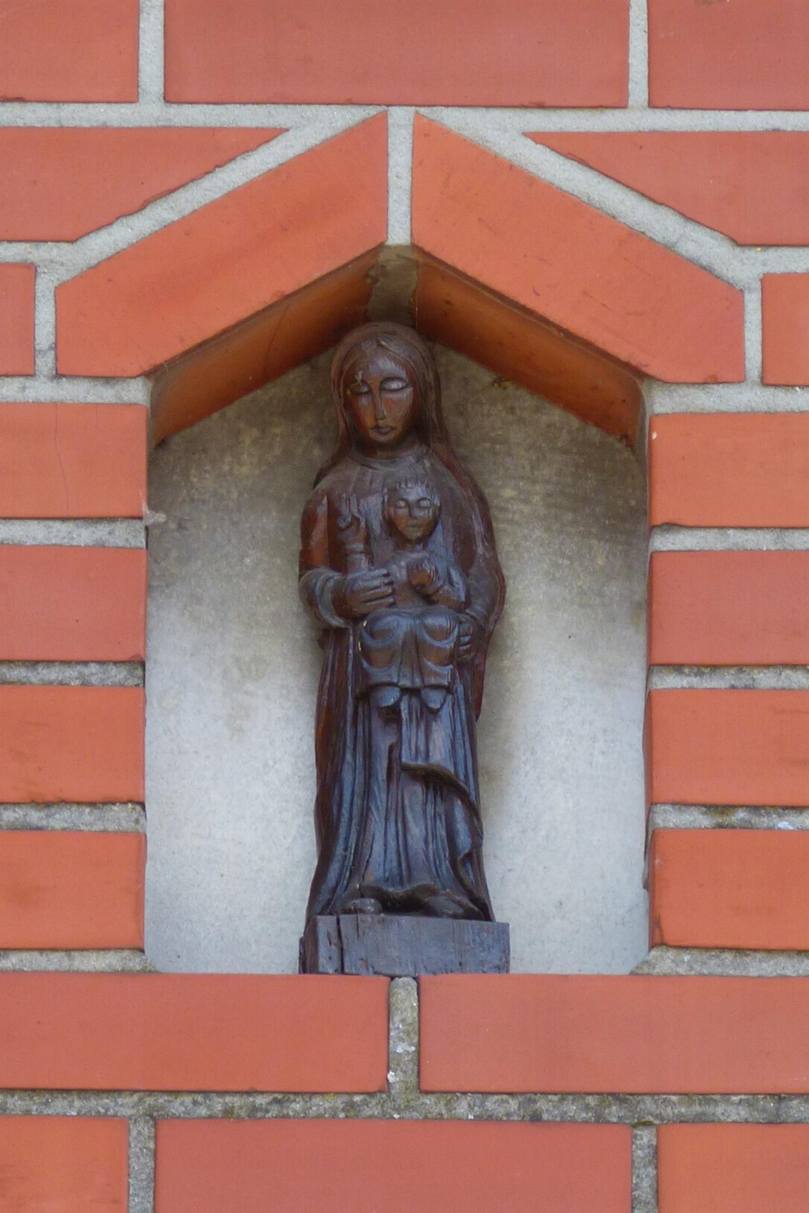 Standort: Die Madonna mit Kind hat ihren Standort in einer Mauernische des Hauses Talstraße 84, in Aphoven, in der Stadt Heinsberg. Beschreibung: Bei der Madonna mit Kind handelt es sich um eine ca 0,50 m hohe Holzfigur über dem Toreingang. Die Mauernische ist eine spitzbogig Mauervertiefung.