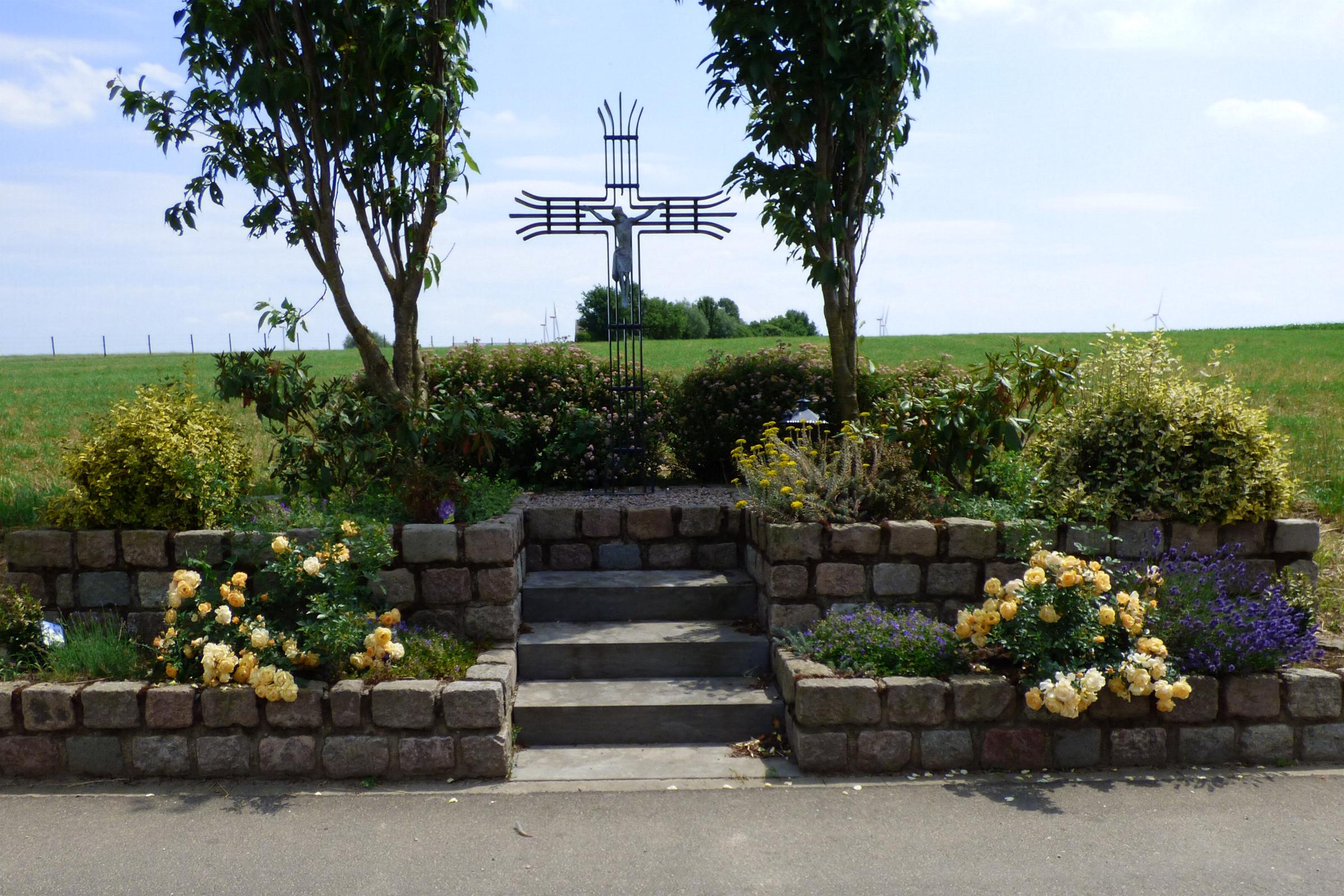 Standort: Das Wegekreuz hat seinen Standort im Stadtteil Dremmen -Boverath, in der Stadt Heinsberg. Beschreibung: Das moderne, strahlenförmige Wegekreuz ist aus Metall und trägt einen Korpus ebenfalls aus Metall. Das Kreuz steht in einer sehr stilvoll angelegten Anlage.