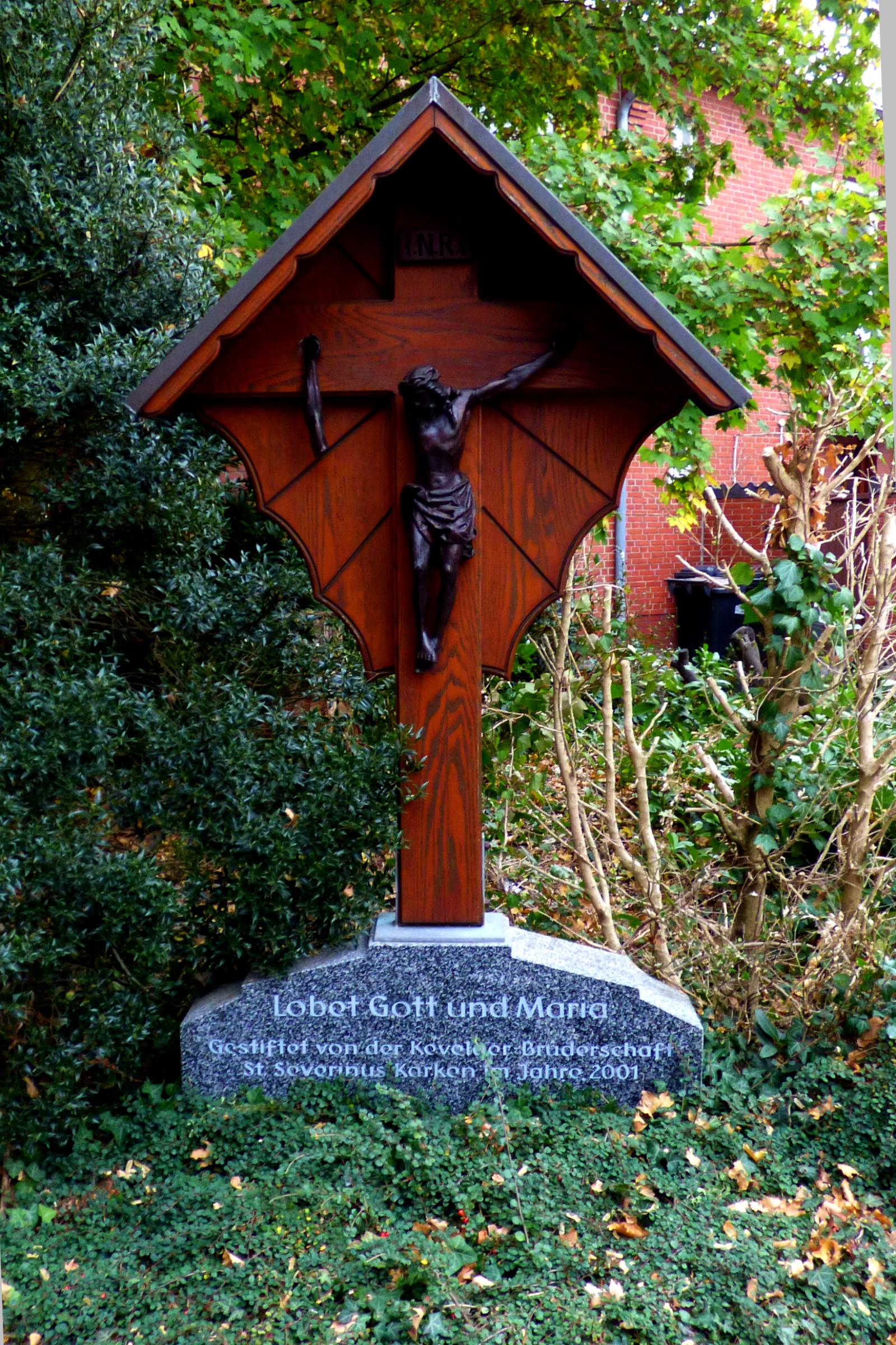 Standort: Das Bruderschaftskreuz hat seinen Standort zwischen der Pfarrkirche St. Severinus und dem Jugendheim, im Stadtteil Karken in der Stadt Heinsberg. Beschreibung: Bei dem Bruderschaftskreuz handelt es sich um ein ca. 2,00 m hohes Holzkreuz mit einem Korpus unter einer Überdachung. Das Kreuz steht auf einem Formstein und wurde 2001 von der Kevelaerbruderschaft St. Severinus Karken gestiftet.
