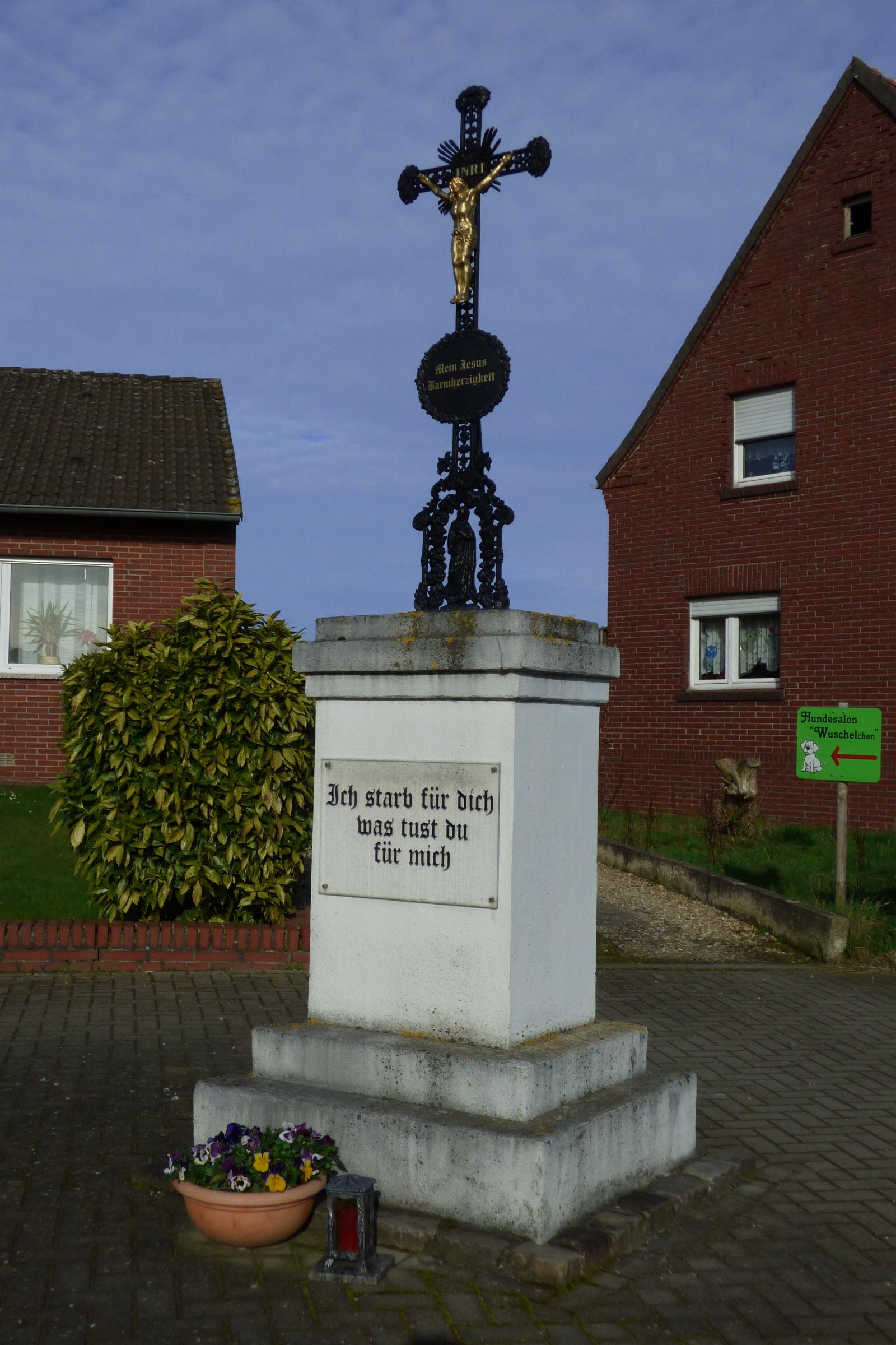 Standort: Das Wegekreuz hat seinen Standort an der Straßenecke Hochbrücker Straße / An der Rur, im Stadtteil Kempen, in der Stadt Heinsberg. Das Kreuz steht mit der Nummer Nr. 38 in der Denkmalliste der Stadt Heinsberg unter Denkmalschutz. Beschreibung: Auf einem zweifach gestuften Grundstein befindet sich ein quadratischer Sockelstein, der ein gußeisernes Kreuz mit Korpus trägt. Auf einer ovalen Plakette steht Mein Jesus Barmherzigkeit. Darunter eine kleine Heiligenfigur. Auf dem großen Sockelstein steht die Inschrift: I c h s t a r b f ü r d i c h w a s t u s t d u f ü r m i c h Quellenhinweis: * Denkmalliste Heinsberg, Nr. 38, Eintrag vom 19. Januar 1984