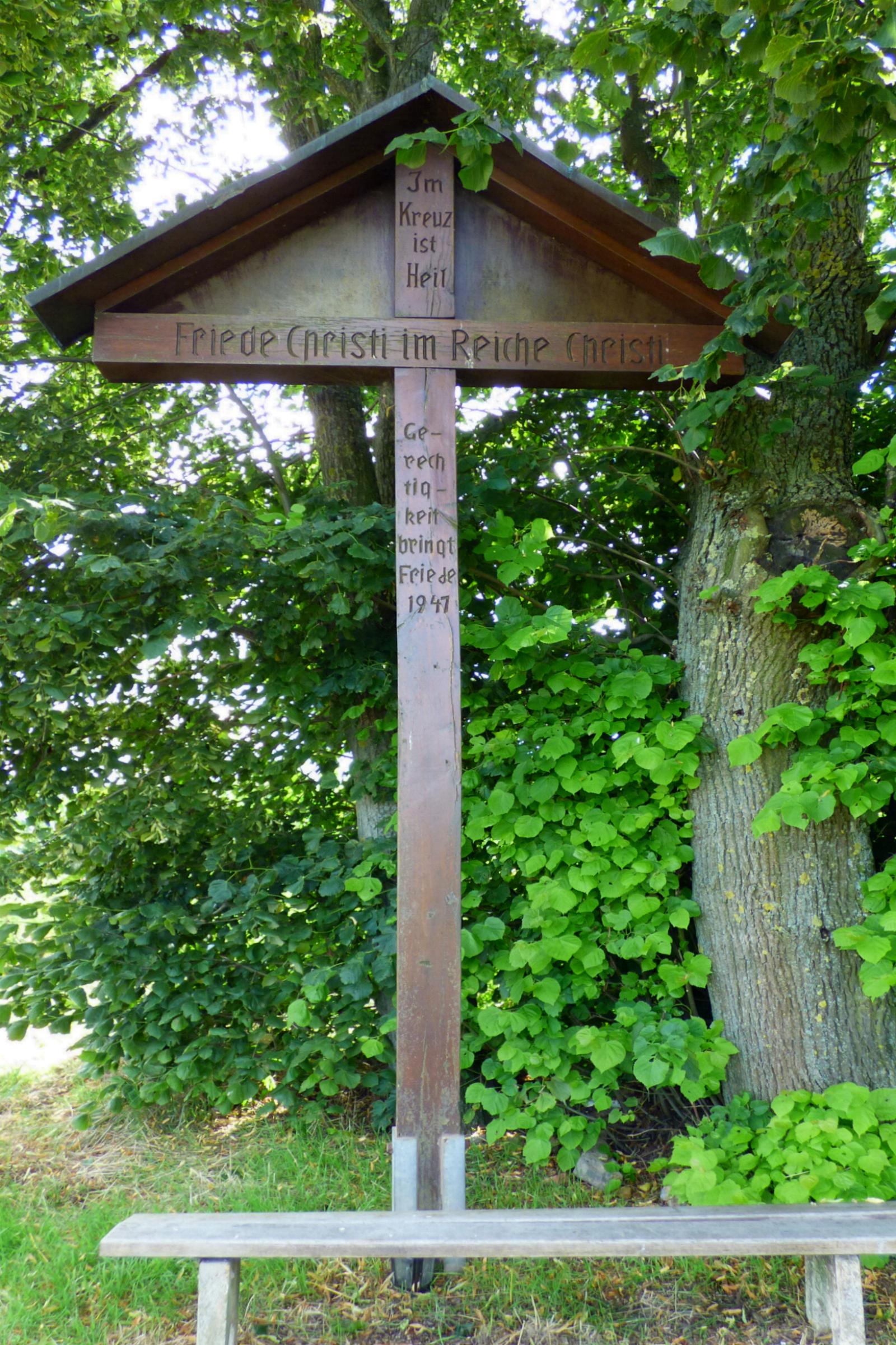 Standort: Das Friedenskreuz hat seinen Standort an den Gemarkungen "Mitten im Feld" und "Buschwegsgen" in der westlichen Feldlage von Kirchhoven, in der Stadt Heinsberg. Beschreibung: Bei dem Friedenskreuz handelt es sich um ein ca. 3,00 m hohes Holzkreuz mit einer Inschrift aus dem Jahre 1947. Das Kreuz steht unterhalb einer schützenden Baumgruppe. Die Inschrift lautet: In Kreuz ist Heil Friede Christi im Reiche Christi Gerechtigkeit bringt Friede 1947