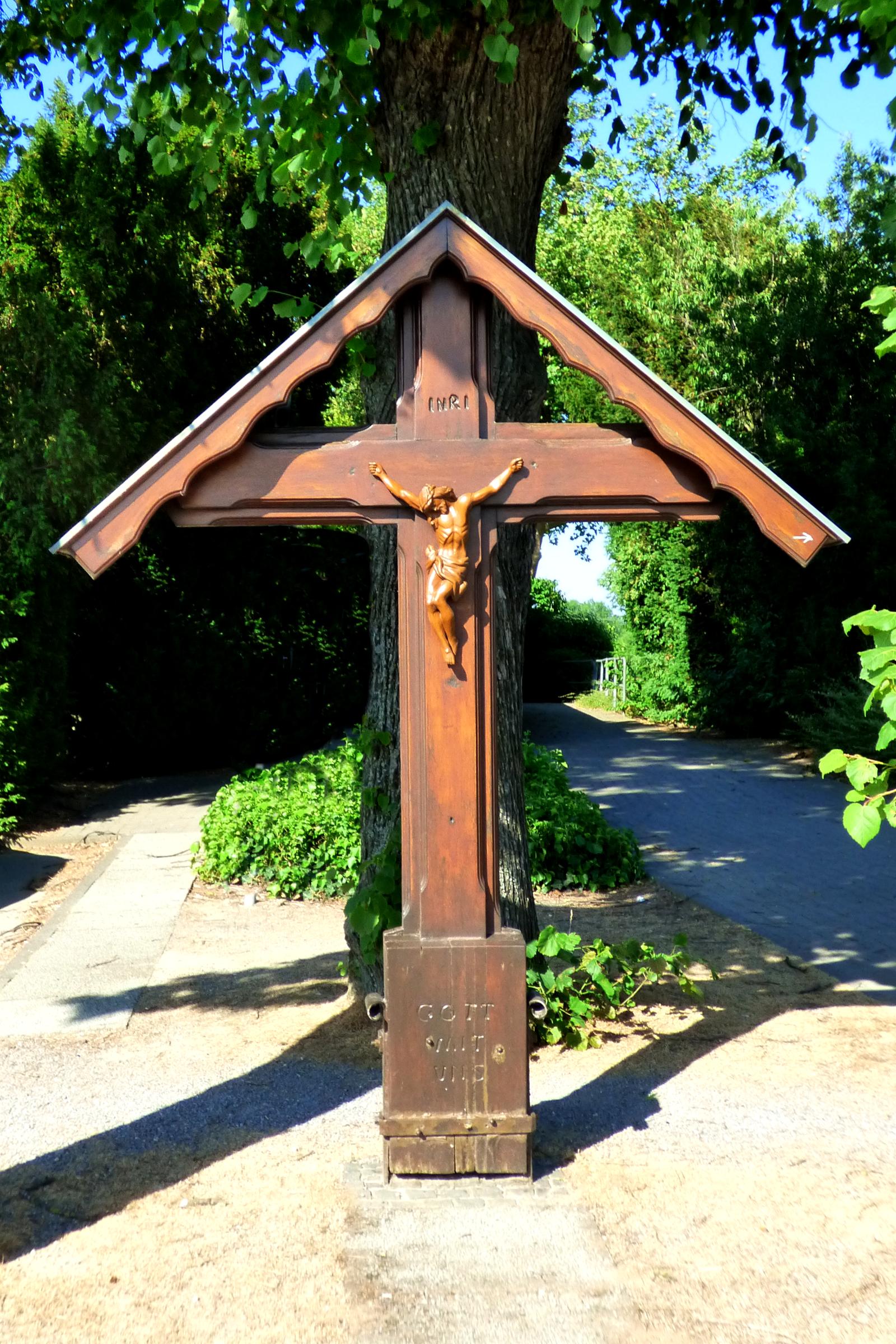 Standort: Das Wegekreuz befindet sich vor dem Eingang des Friedhofs an der Rurstraße 80, im Stadtteil Oberbruch, in der Stadt Heinsberg. Beschreibung: Bei dem Wegekreuz handelt es sich um eine ca. 2,50 m hohes Holzkreuz mit einem Korpus unter einer Überdachung. Am Kreuzfuß stehen die Worte: GOTT MIT UNS