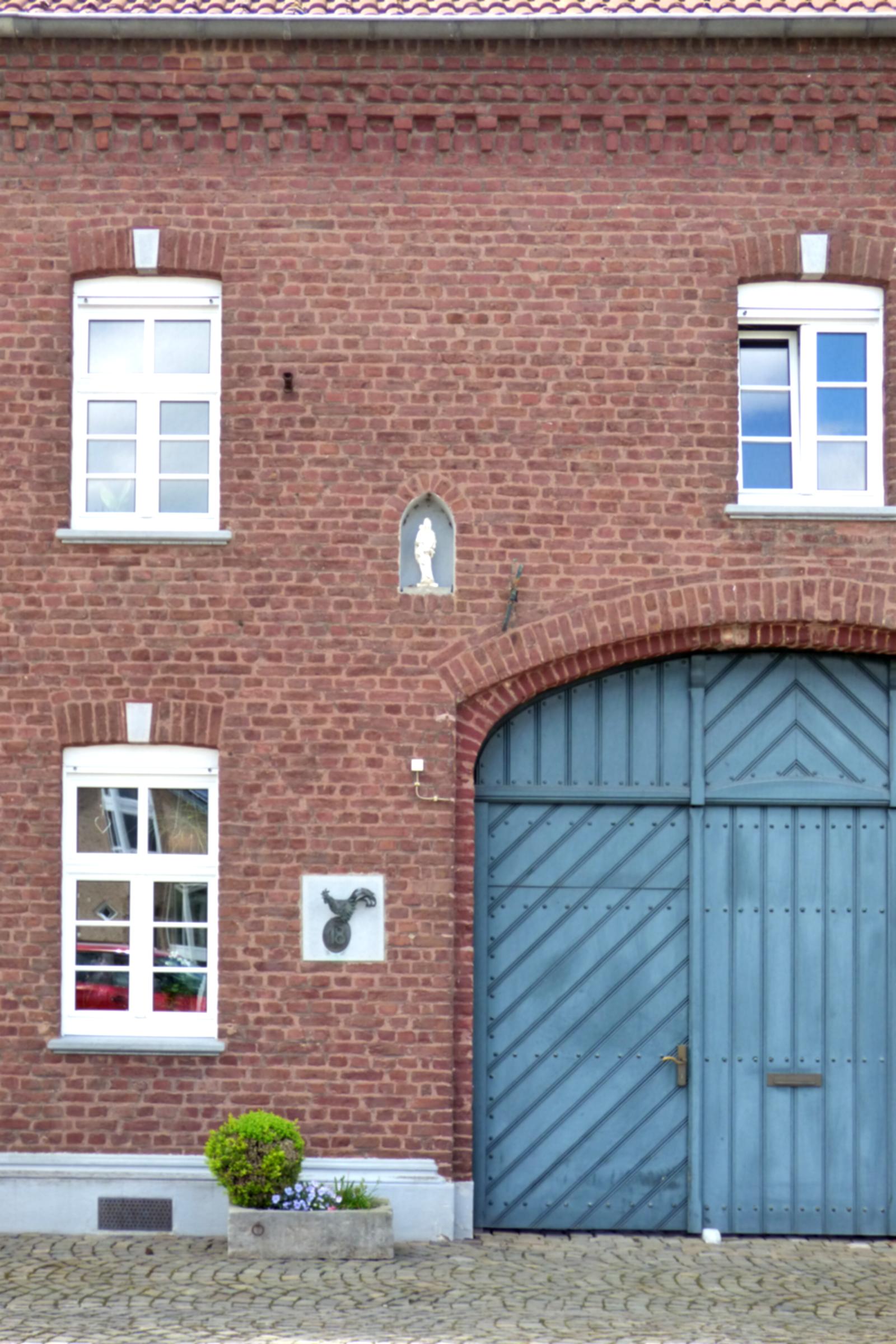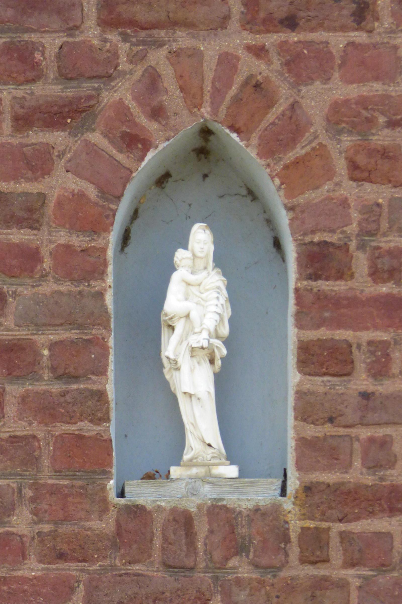 Standort: Die Madonna mit Kind hat ihren Standort in der Hauswand in Pütt 18, in der Stadt Heinsberg. Beschreibung: Bei der Madonna mit Kind handelt es sich um eine ca. 0,50 m hohe Figur in einer Mauernische. Die Figur befindet sich am Toreingang.