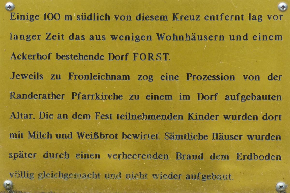 Standort: Das Forster Gedenkkreuz hat seinen Standort am Parkstreifen an der Uetterather Straße im Stadtteil Randerath, in der Stadt Heinsberg. Beschreibung: Bei dem Objekt handelt es sich um ein ca. 2,50 m hohes Gedenkkreuz mit einem Metallkorpus. Am Sockel des Kreuzes ist eine Inschrifttafel angebracht. Das Gedenkkreuz trägt die Inschrift: Oh Wanderer durch alle Zeiten soll'n Gottes Engeln dich begleiten !