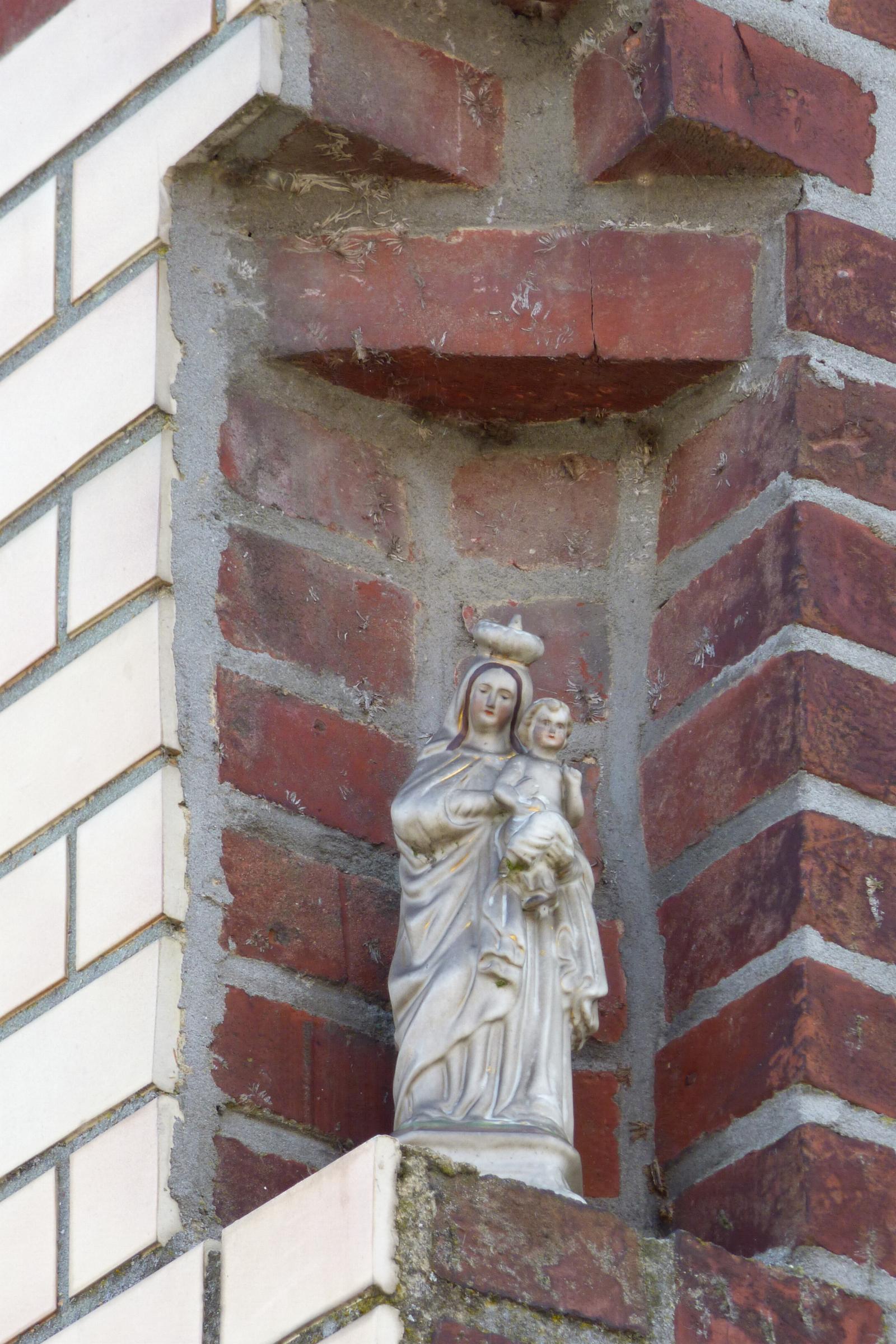 Standort: Die Madonna mit Kind hat ihren Standort in der Hauswand Waldhufenstraße 140 in Straeten, in der Stadt Heinsberg. Beschreibung: Bei der Madonna mit Kind handelt es sich um eine ca. 0,40 m hohe Figur in einer Mauernische.