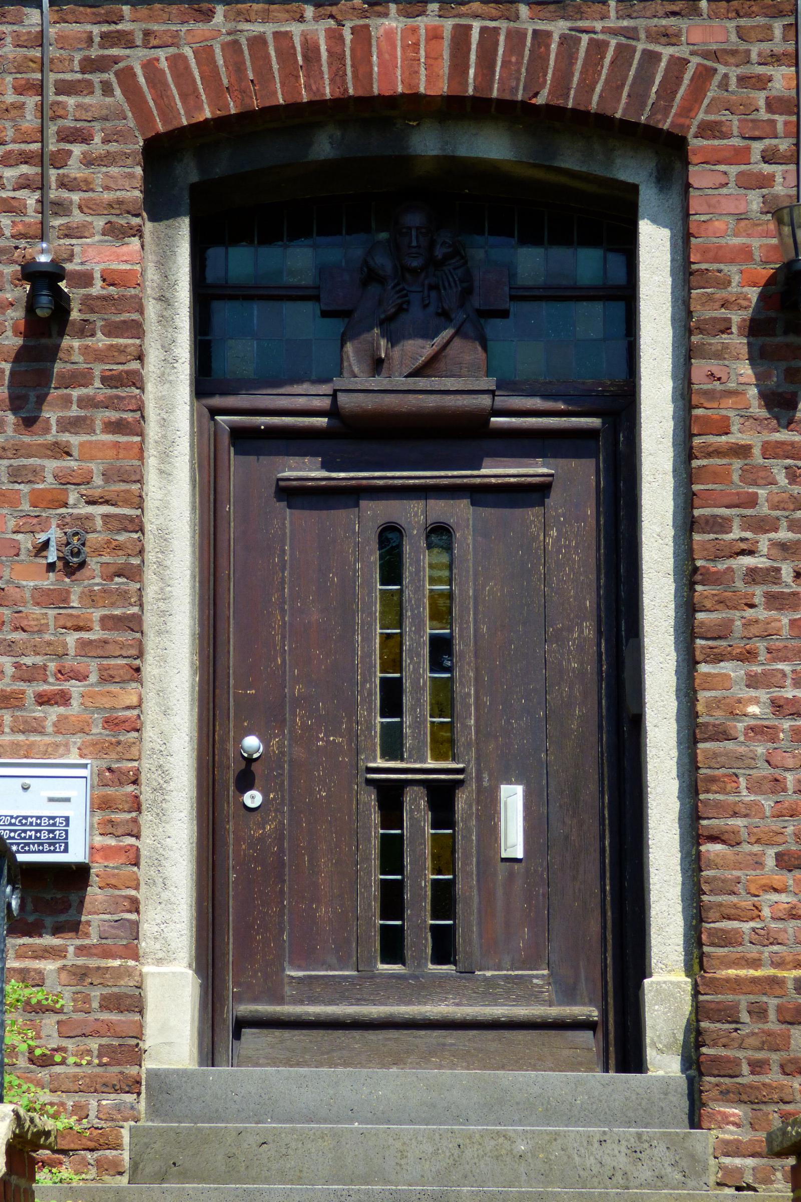 Standort: Die Figur des Guten Hirten befindet sich oberhalb der Eingangstüre des Pfarrhauses an der Kirche in Uetterath, in der Stadt Heinsberg. Beschreibung: Der Gute Hirte ist im Oberlicht der Eingangstüre zum Pfarrhaus angebracht.