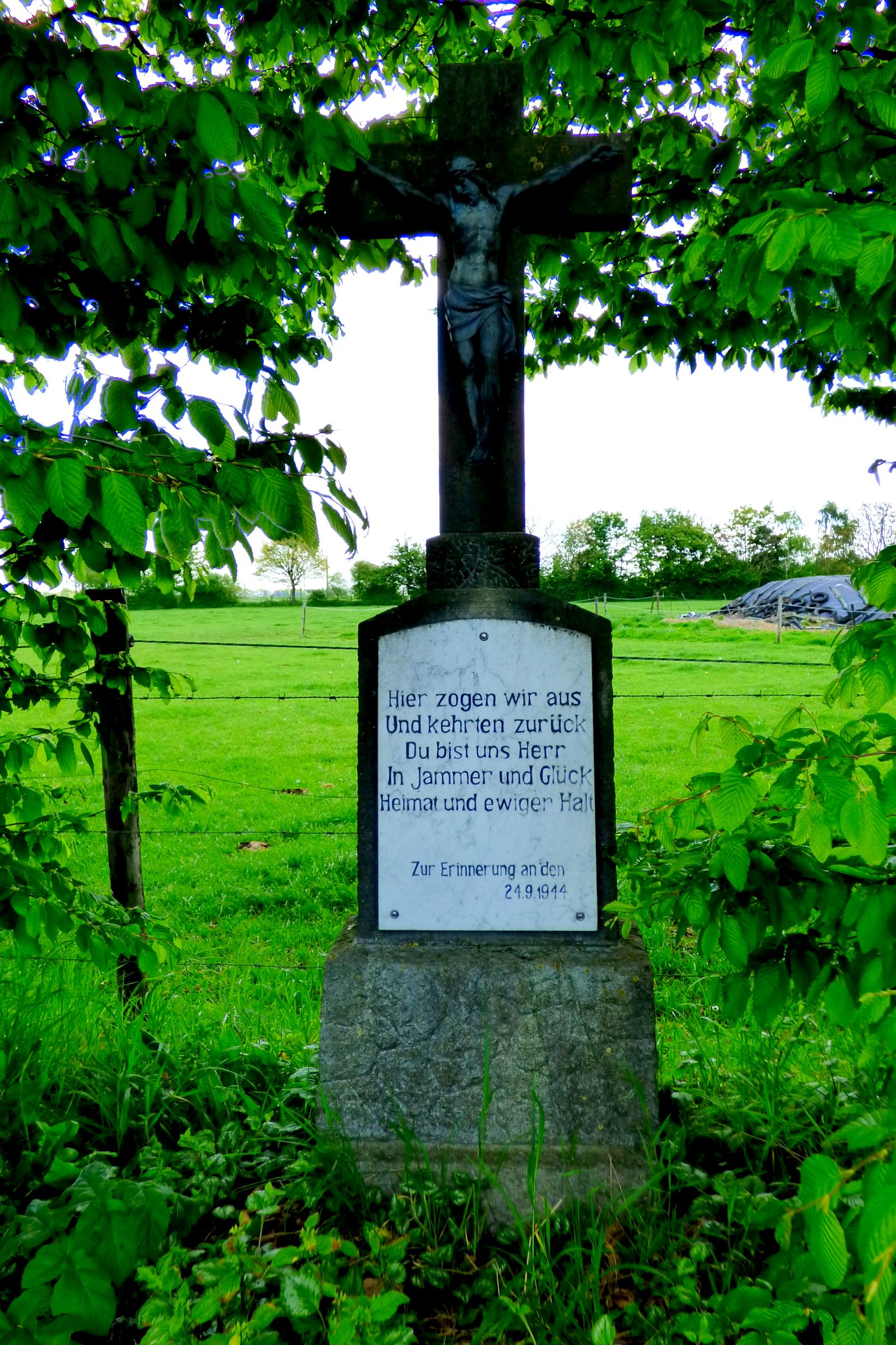 Standort: Das Gedenkkreuz hat ihren Standort an der Landstraße K 13, in Waldenrath, in der Stadt Heinsberg. Beschreibung: Bei dem Gedenkkreuz handelt es sich um ein ca. 2,50 m hohes Steinkreuz mit einem Metallkorpus. Das Kreuz stammt aus dem Jahr 1944 und trägt im mittleren Kreuzteil steht die Inschrift: Hier zogen wir aus Und kehrten zurück Du bist uns Herr In Jammer und Glück Heimat und ewiger Halt. Zur Erinnerung an den 24.9.1944, dem Tag der Evakuierung der Ortsbevölkerung Quellenhinweis * Dritte Ausgabe 1994: Handbuch des Bistums Aachen ISBN 3-87448-172-7 S. 759