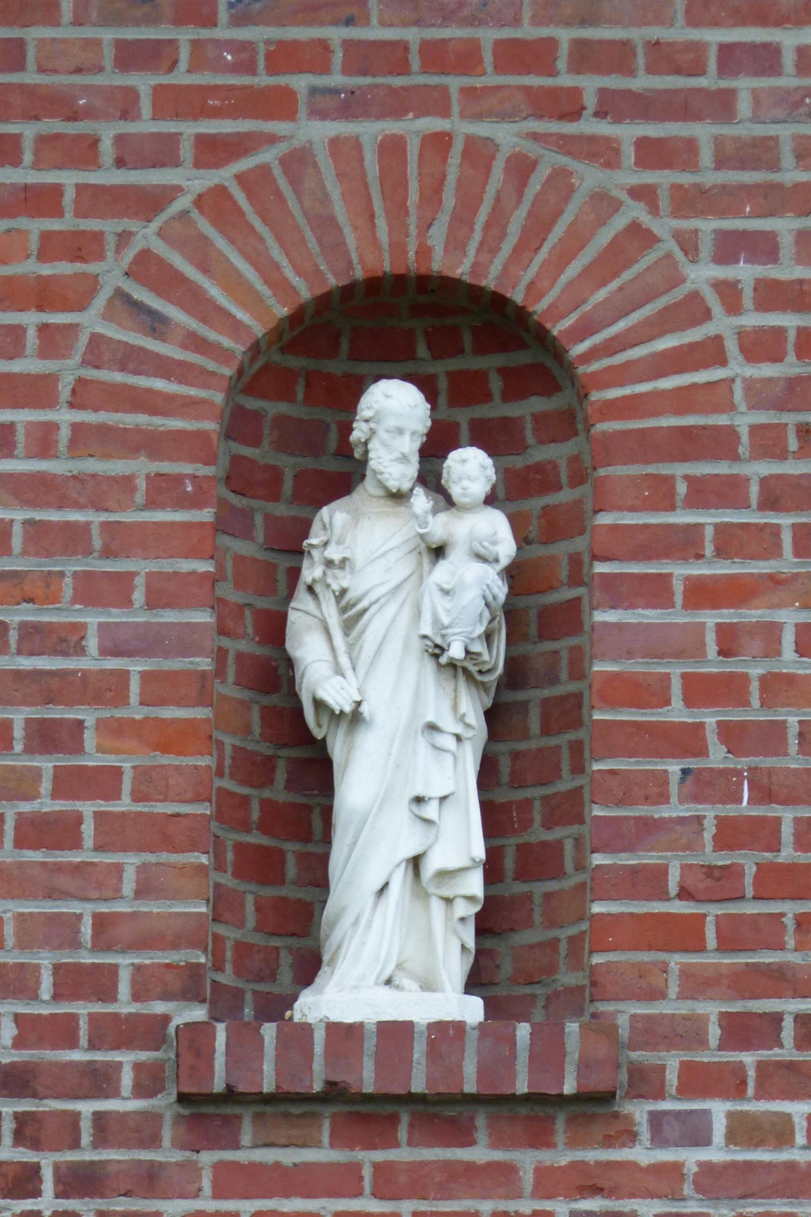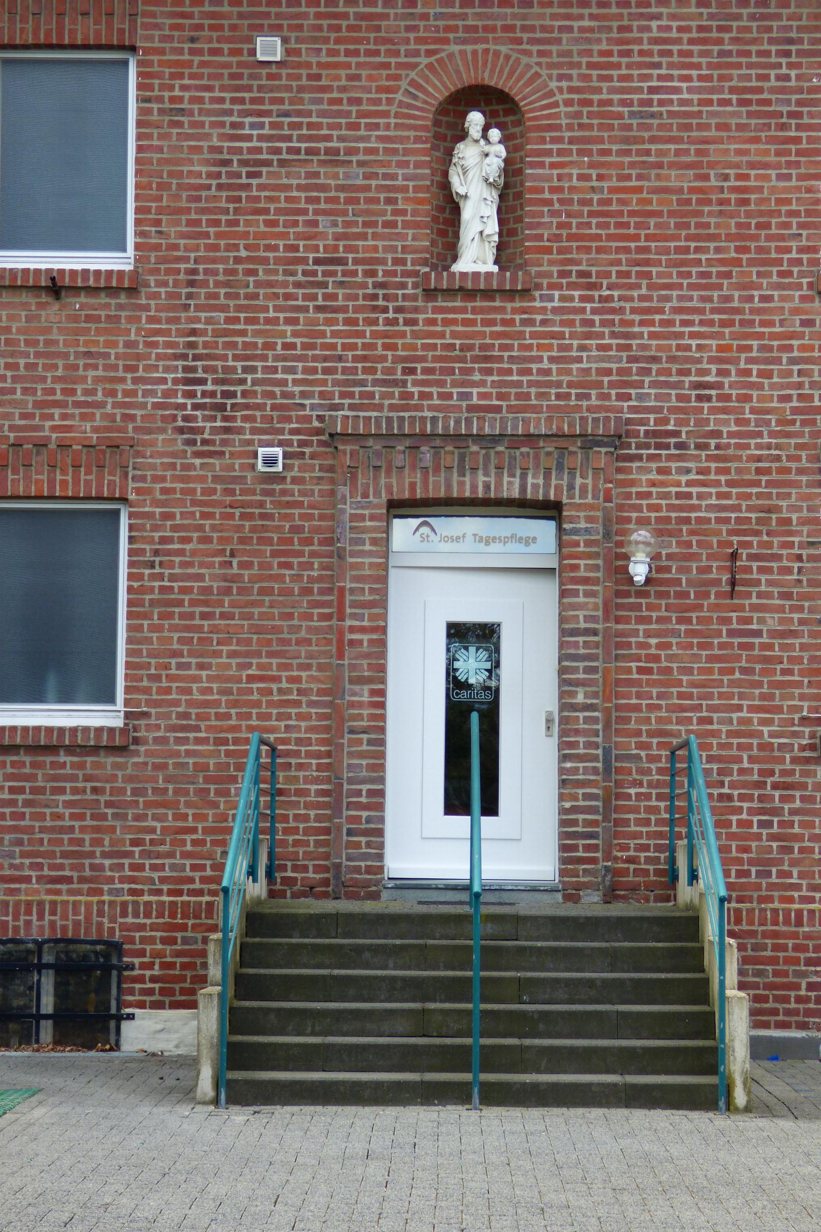 Standort: Die St. Antoniusfigur mit Kind hat ihren Standort an der Langbroicher Straße 7, in Waldenrath, in der Stadt Heinsberg. Beschreibung: Bei der St. Antoniusfigur mit Kind handelt es sich um eine ca. 1,20 m hohe Steinfigur in einer rundbogigen Mauernische. Die Figur befindet sich über dem Eingang des Caritas-Hauses Tagespflege.