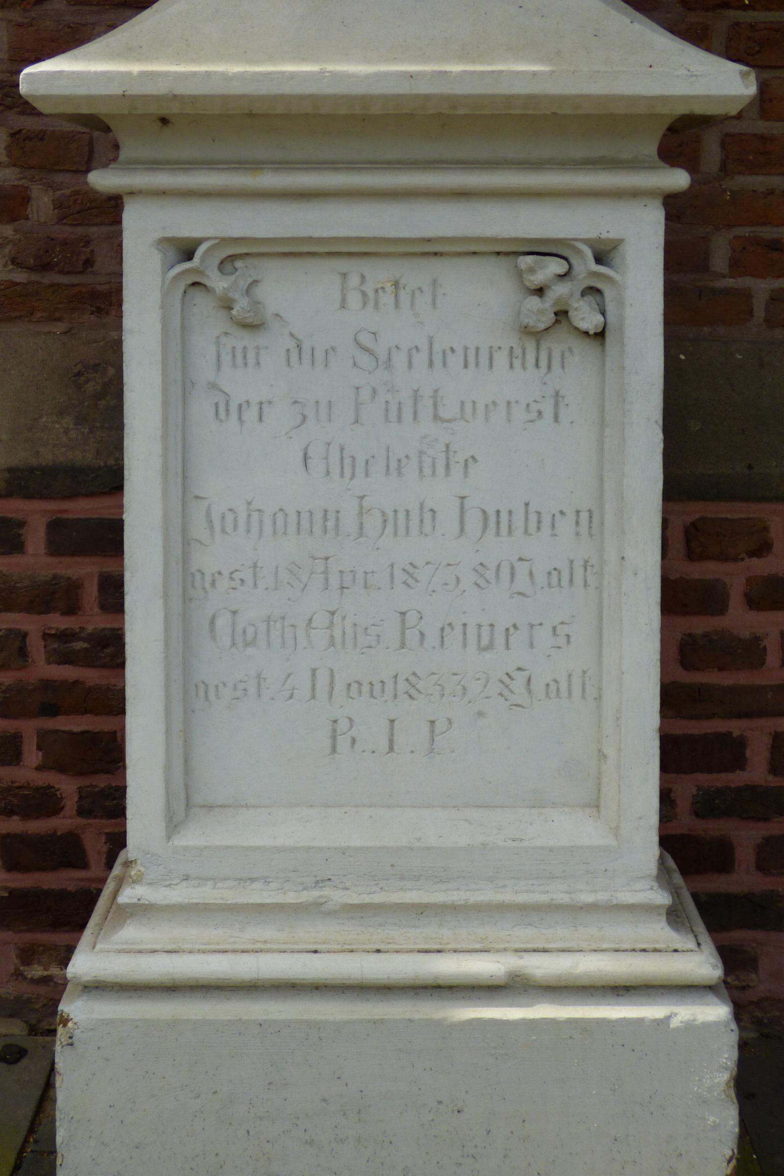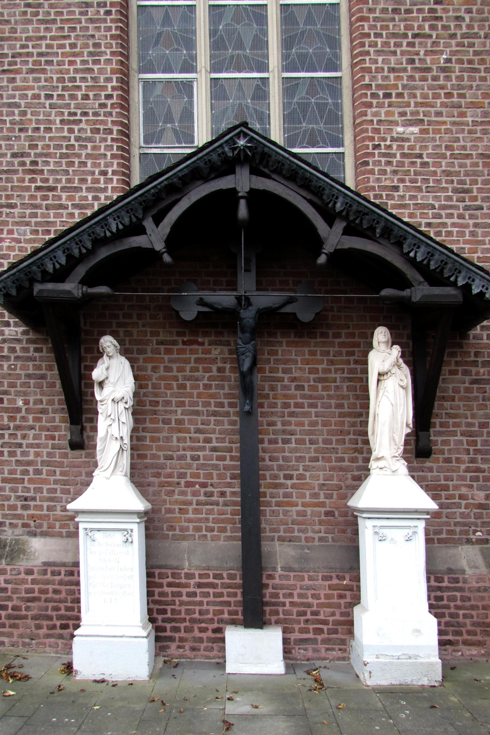 Standort: Die Kreuzigungsgruppe hat ihren Standort an der Pfarrkirche in Waldenrath, in der Stadt Heinsberg. Beschreibung: Bei der Kreuzigungsgruppe handelt es sich um ein Kreuz ca 4,00 m hoch und zwei auf Säulen stehende Figuren ca. 3,50 m hoch unter einer Überdachung. Auf der linken Säule steht die Inschrift: Betet für die Seelenruhe der zu Pütt verst. Eheleute Johann Hub. Huben gest. 18. Apr. 1873 80 J. alt Cath. Elis. Reivers gest. 4. Nov. 1833 28 J. alt R. I. P.