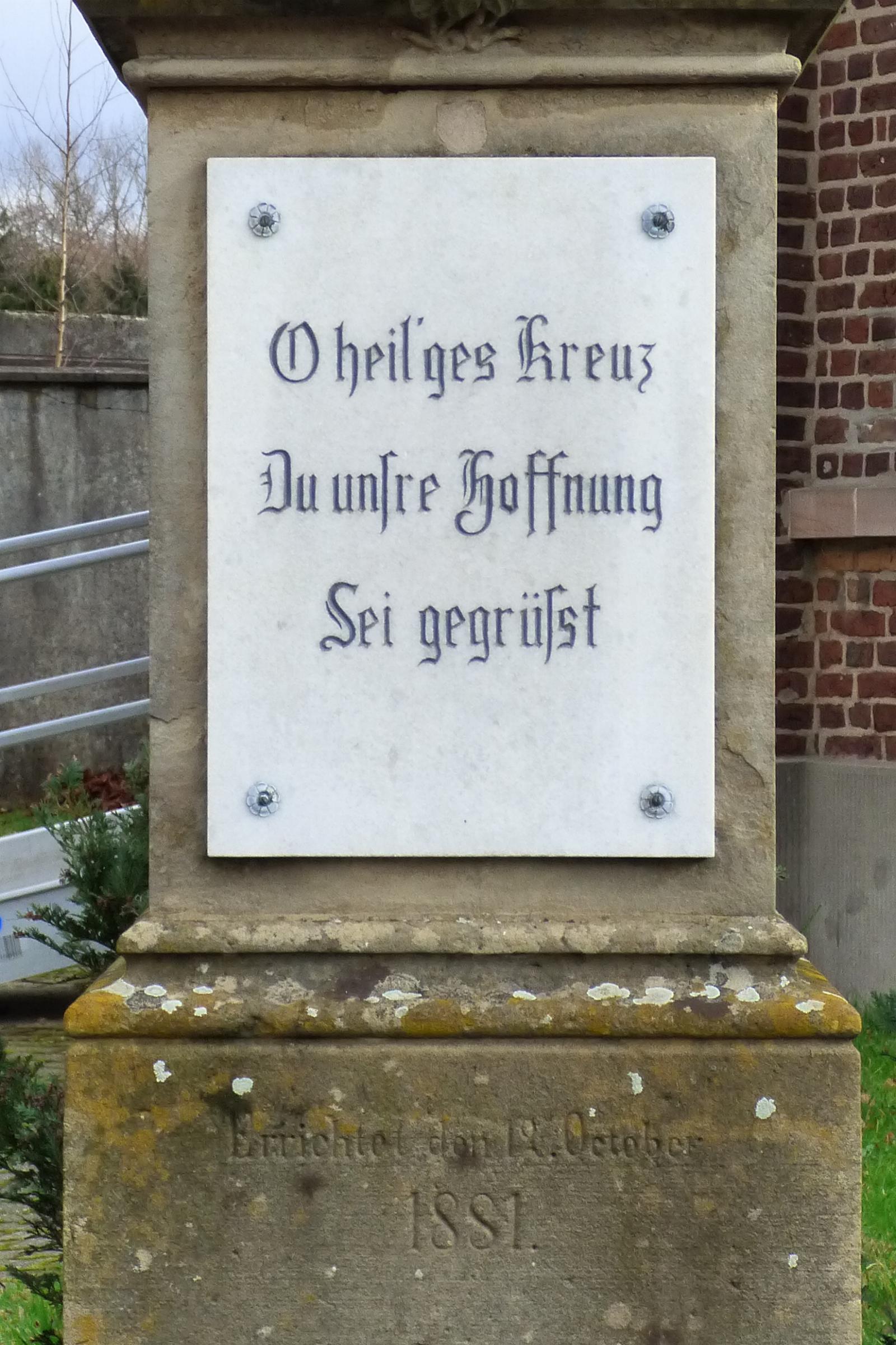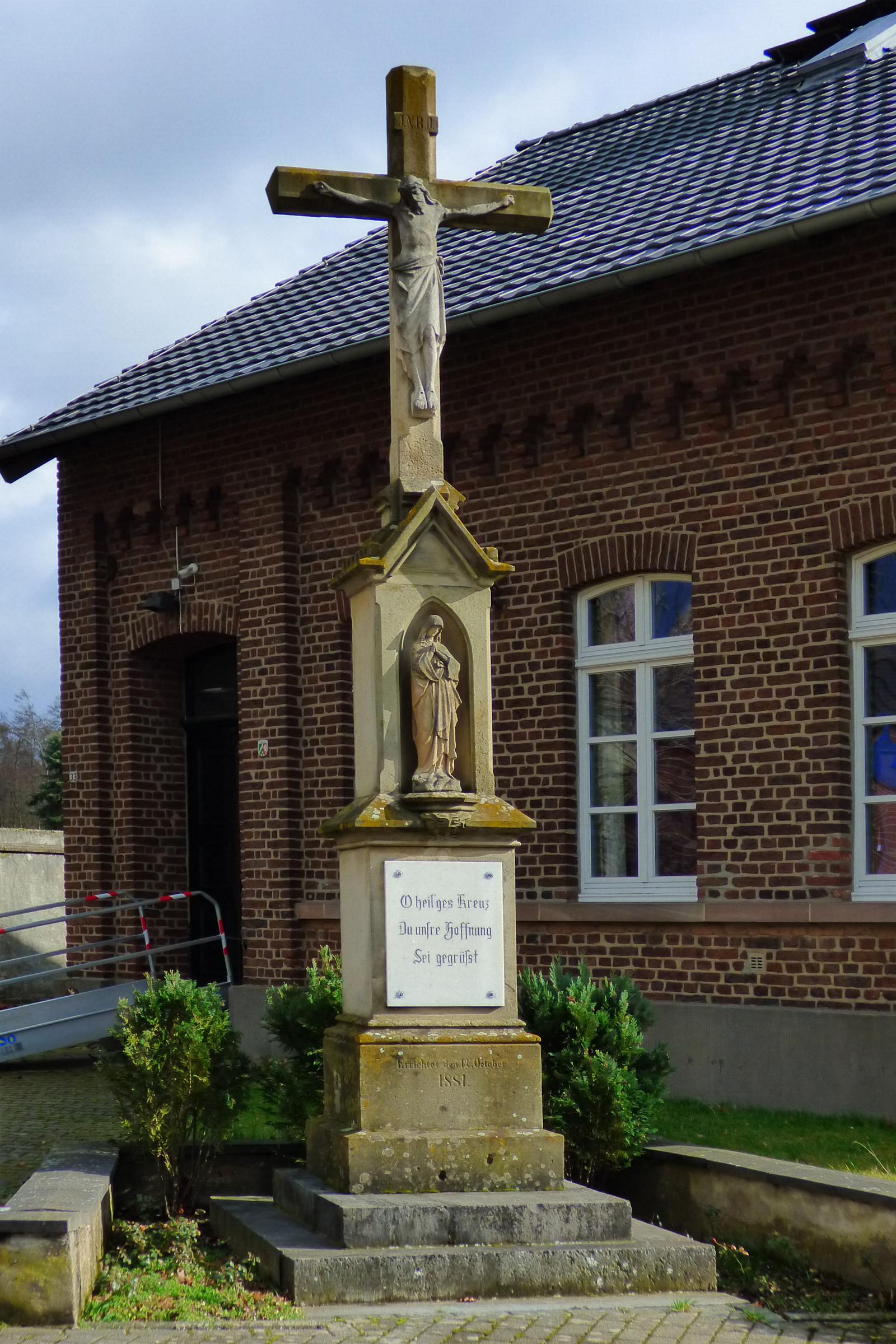 Standort: Das Wegekreuz hat seinen Standort neben der ehemaligen Schule in Altmyhl, in der Stadt Hückelhoven. Das Kreuz steht mit der Nr. 35 in der Denkmalliste der Stadt Hückelhoven unter Denkmalschutz. Beschreibung: Bei dem Dorfkreuz handelt es sich um ein neugotisches Steinkreuz aus Sandstein mit einem Steinkorpus. Im mittleren Teil des Kreuzes befindet sich in einer Nische eine Madonnenfigur. Das Kreuz stammt von H. Josten , Bildhauer aus Baal und wurde am 12. Oktober 1881 errichtet. 1980 wurde das Kreuz restauriert. Inschrift: Auf einer Tafel steht folgende Inschrift: O heiliges Kreuz Du unsere Hoffnung Sei gegrüßt Quellenhinweis * Denkmalliste Hückelhoven, Nr. 35, Eintrag: 21. Januar 1983