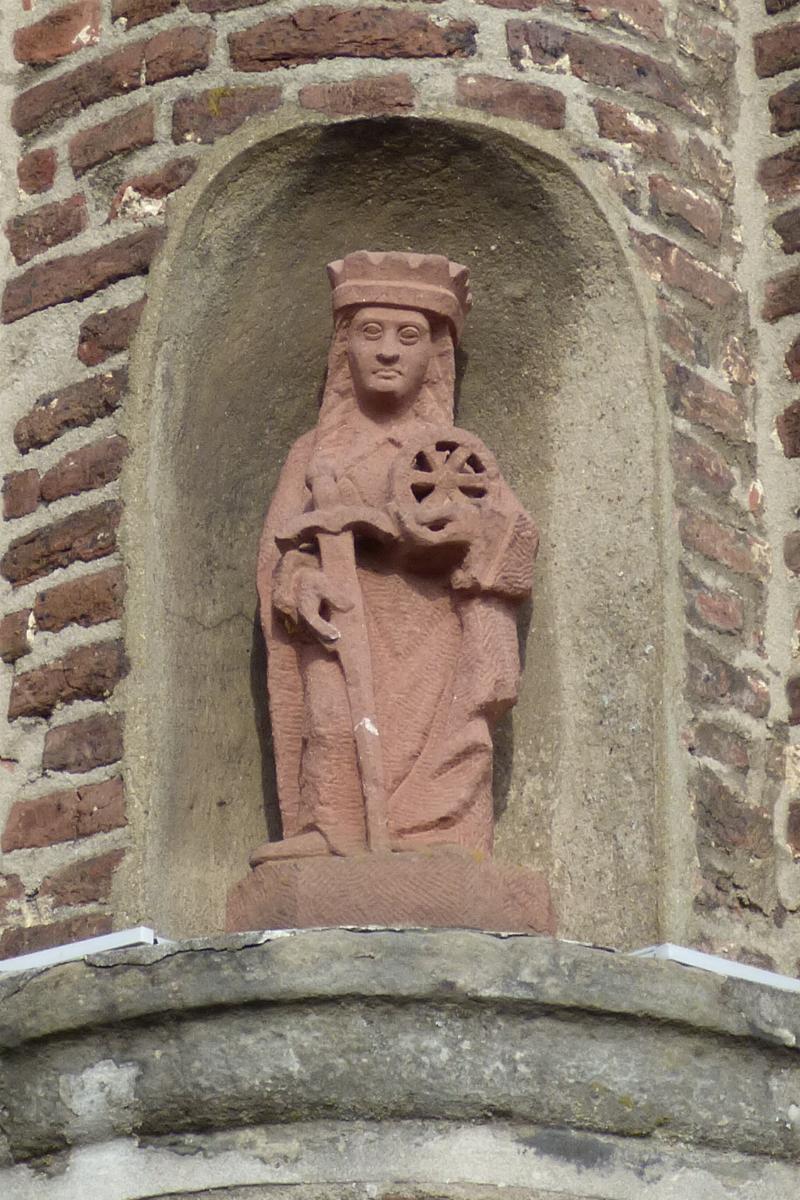 Standort: In einer Wandnische der Kirche in Doveren befindet sich die Figur der hl. Katharina. Die Nische ist Aussen an der Südwestecke des Kirchengebäudes eingelassen und diente ursprünglich als Laternennische. Sie befindet sich in etwa 4,00 m Höhe. Die Figur hat eine Größe von ca. 0,80 m. * Die hl. Katharina von Alexandrien bei Wikipedia