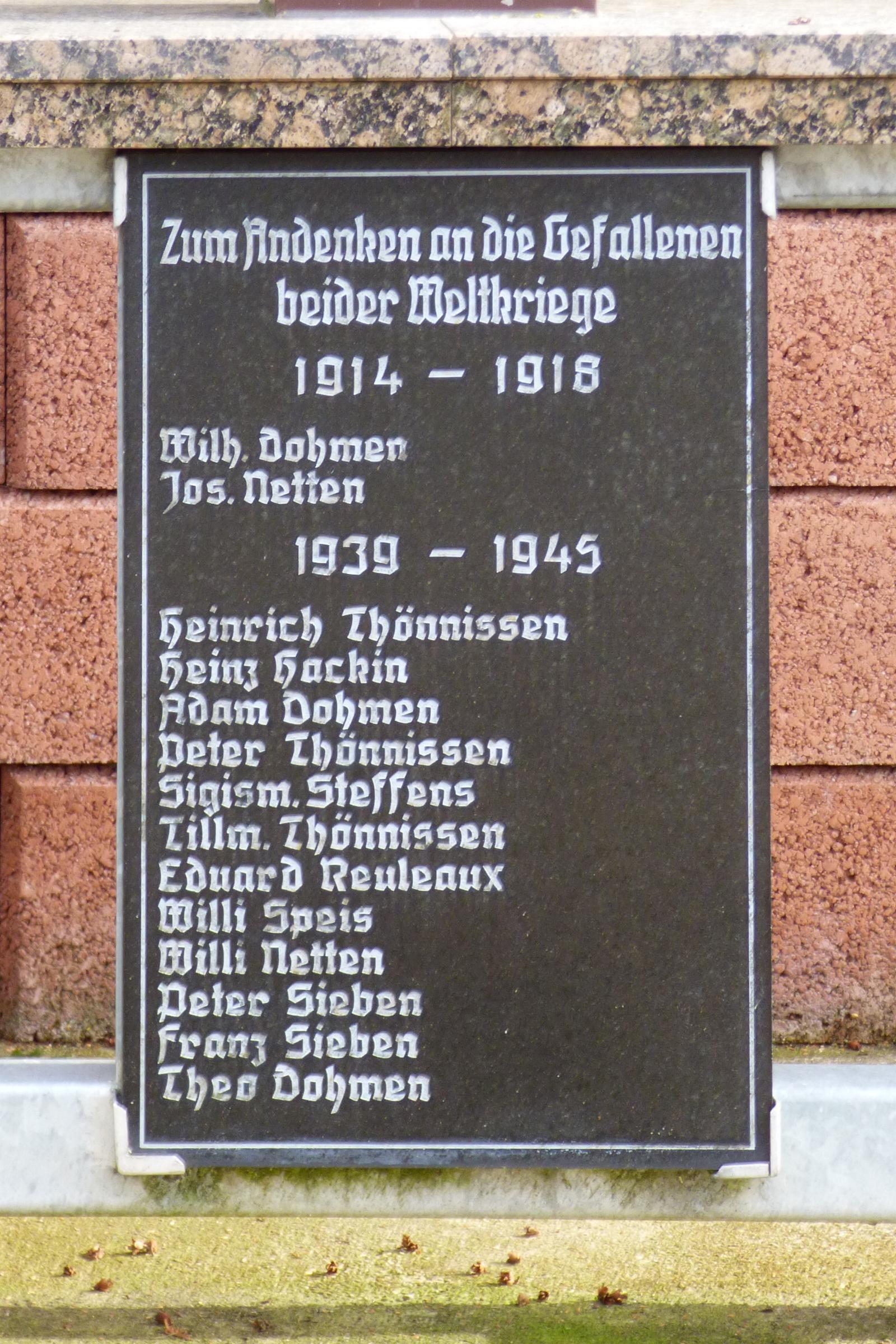 Standort: Das Wege- und Gedenkkreuz hat seinen Standort in Doverhahn Nr. 85, im Stadtteil Doveren, in der Stadt Hückelhoven. Denkmalbeschreibung: Bei dem Wegekreuz handelt es sich um ein 2,50 m hohes Holzkreuz mit einem Korpus unter einem schmalen Satteldach. Das Kreuz steht auf einem altarähnlichen Steintisch und stammt aus der Mitte des 20. Jahrhunderts. Vor dem Altar ist eine Gedenktafel mit den Namen der Gefallenen beider Weltkriege angebracht. Quellenhinweis * Dritte Ausgabe 1994: Handbuch des Bistums Aachen ISBN 3-87448-172-7 S. 767