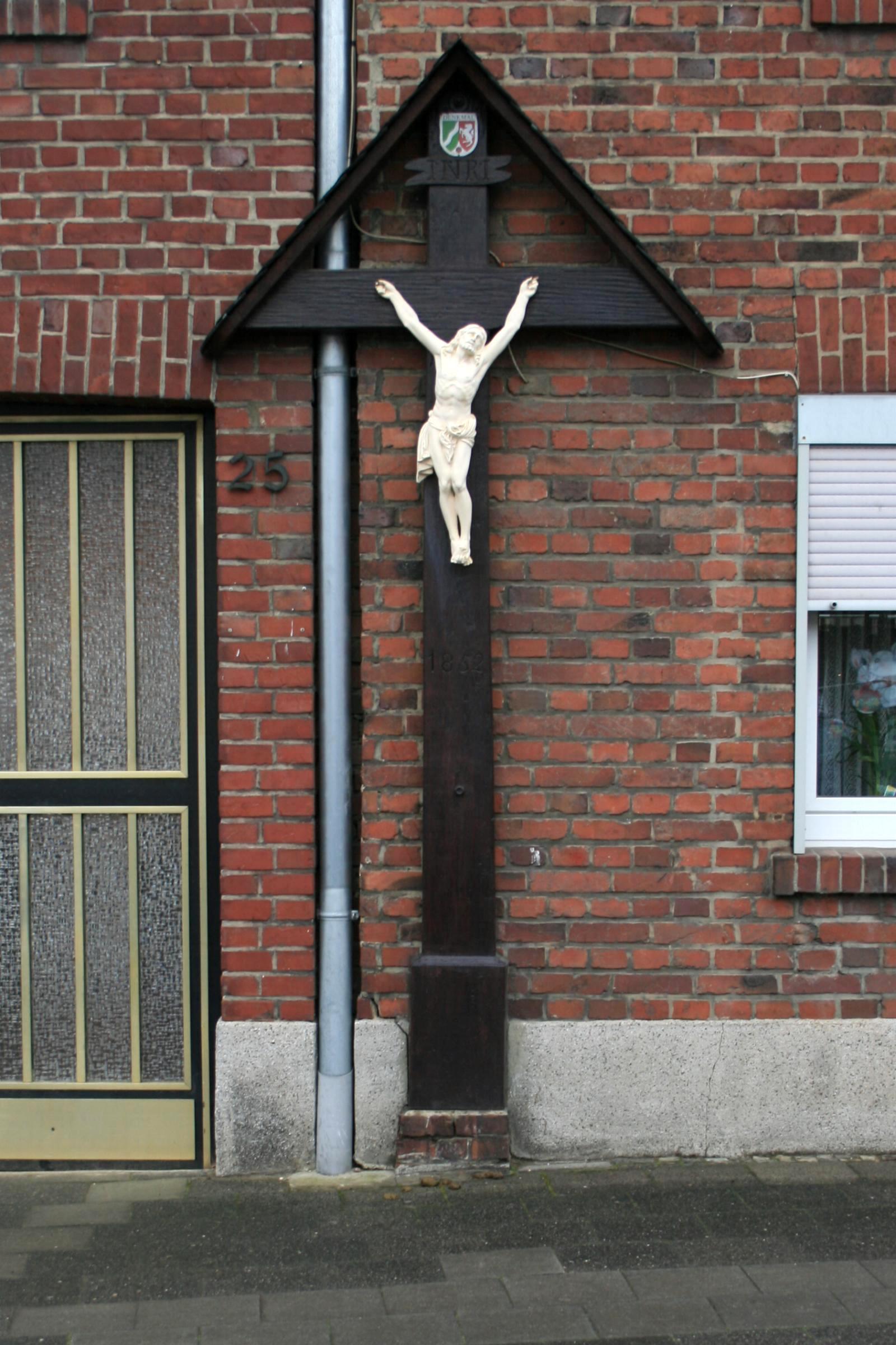 Standort: Das Wegekreuz hat seinen Standort am Markt 25, in der Stadt Hückelhoven. Das Holzkreuz steht mit der Nr. 97 in der Denkmalliste der Stadt Hückelhoven unter Denkmalschutz. Beschreibung: Bei dem Objekt handelt es sich um ein ca. 3,25 m hohes Holzkreuz mit einem Holzkorpus und einer Überdachung. Das Kreuz stammt aus dem Jahr 1852. Eine Restaurierung fand im Jahre 1986 statt. Quellenhinweis: * Denkmalliste Hückelhoven, Nr. 97, Eintrag: 30. April 1987 * Dritte Ausgabe 1994: Handbuch des Bistums Aachen ISBN 3-87448-172-7 S. 773