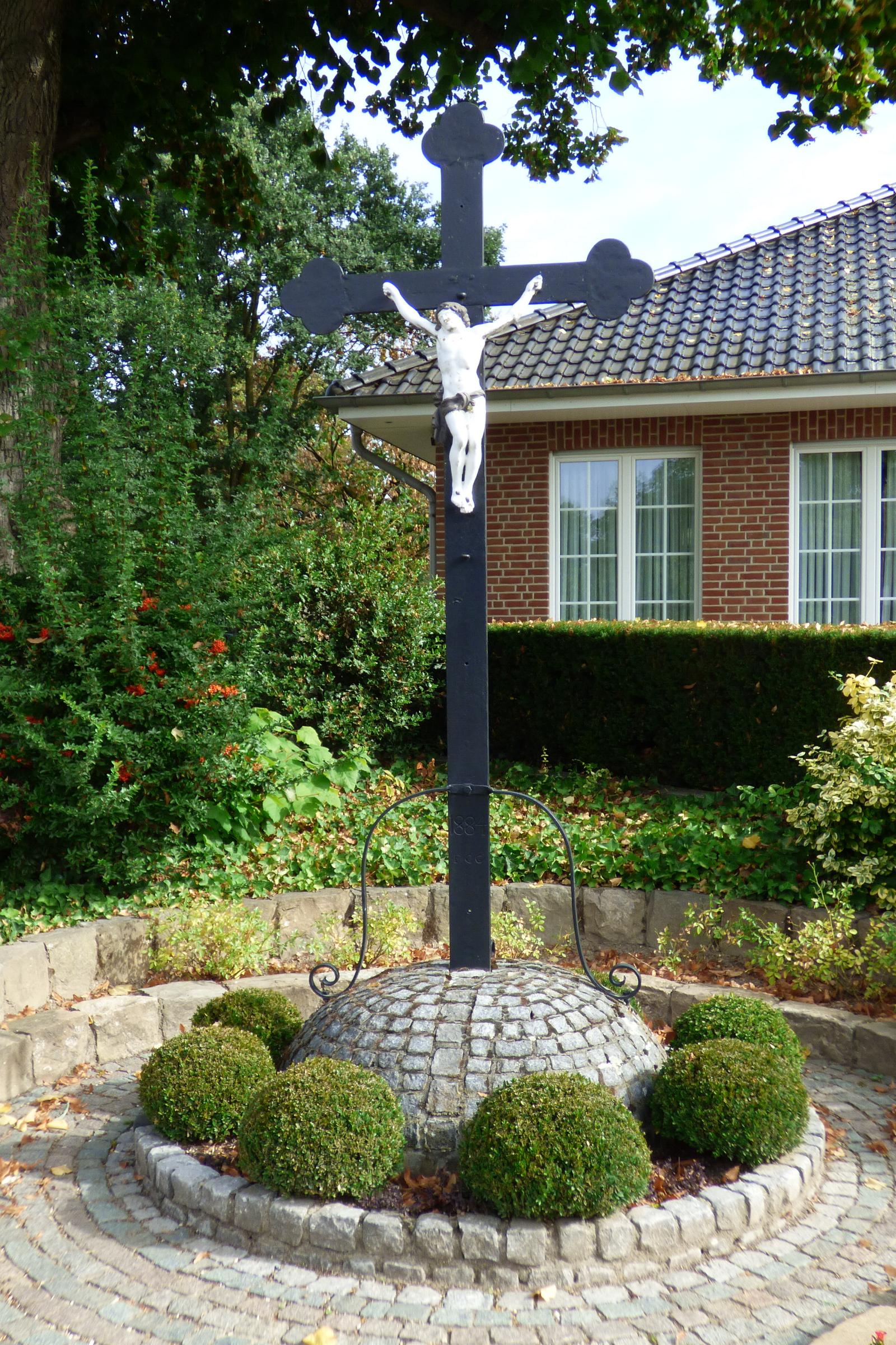Standort: Das Wegekreuz hat seinen Standort im Vorgarten Nr. 16a, im Ortsteil Stein-Lind, in der Gemeinde Selfkant. Geschichte: Bei dem Wegekreuz handelt es sich um ein ca. 2,20 m hohes Metallkreuz mit einem Korpus auf einem gemauerten Kugelsteinsockel.